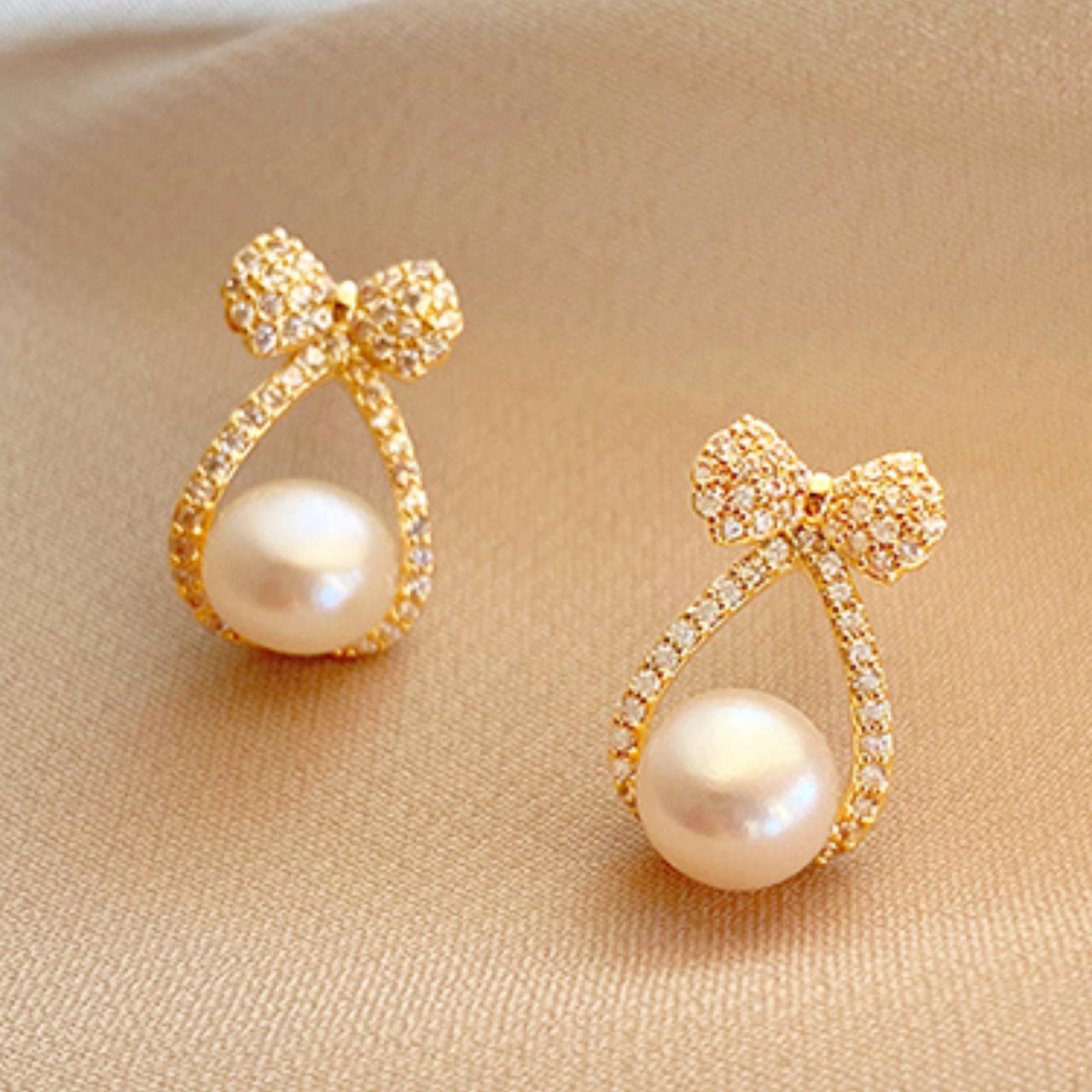 リボンをモチーフにしたデザインが特徴のピアス。優雅さと女性らしさを引き立てます。淡水パールの輝きが顔周りを明るく演出し、カジュアルからフォーマルなシーンまで幅広く活躍するアイテムです。特別な日のコーディネートに華を添える一品です!