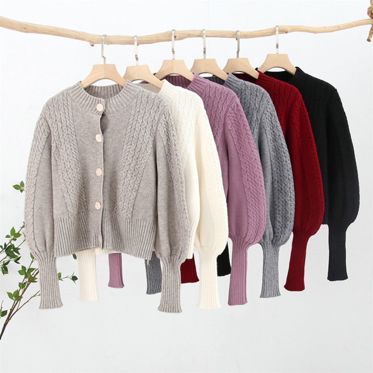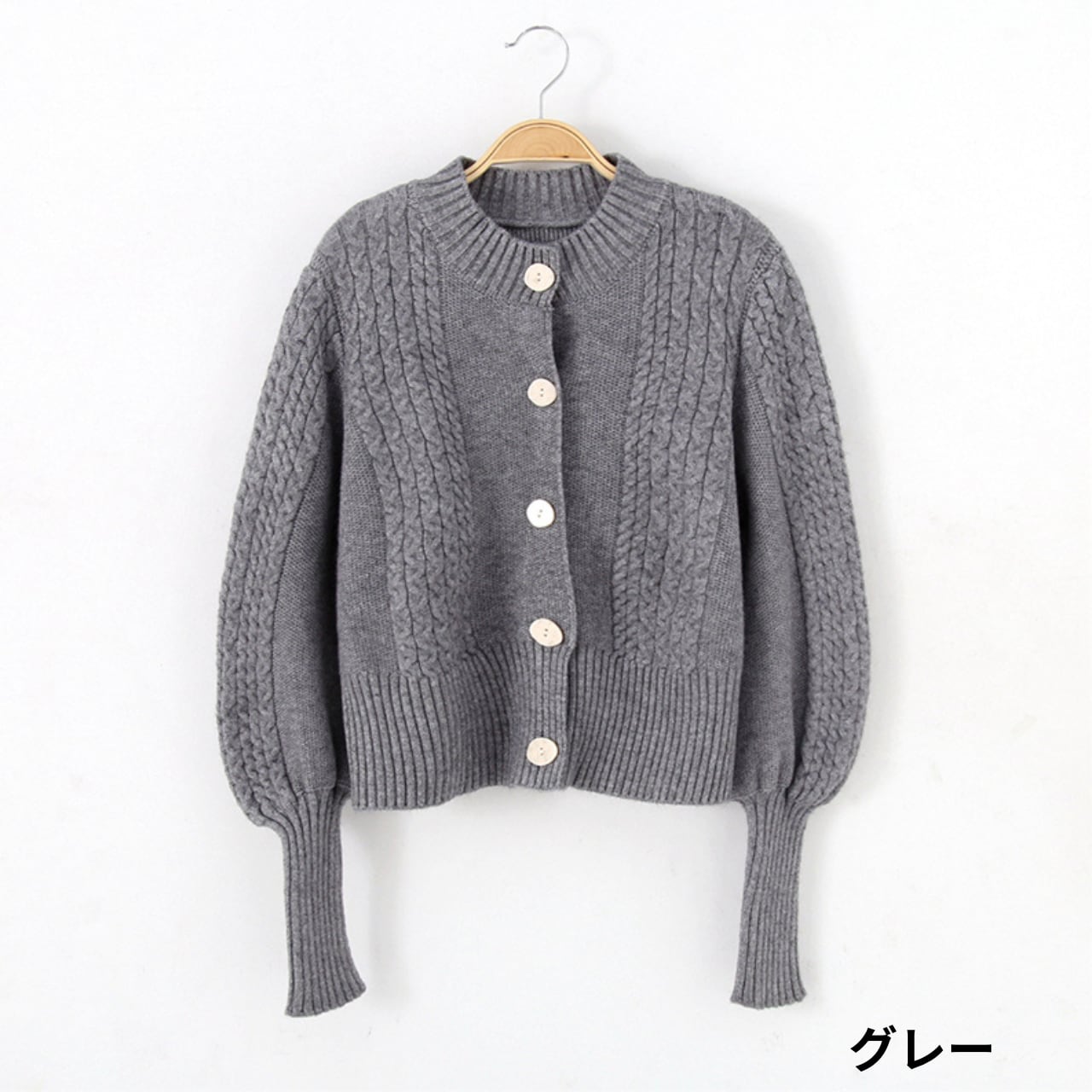 クルーネック パフスリーブ 長袖 ニットカーディガン T-0032