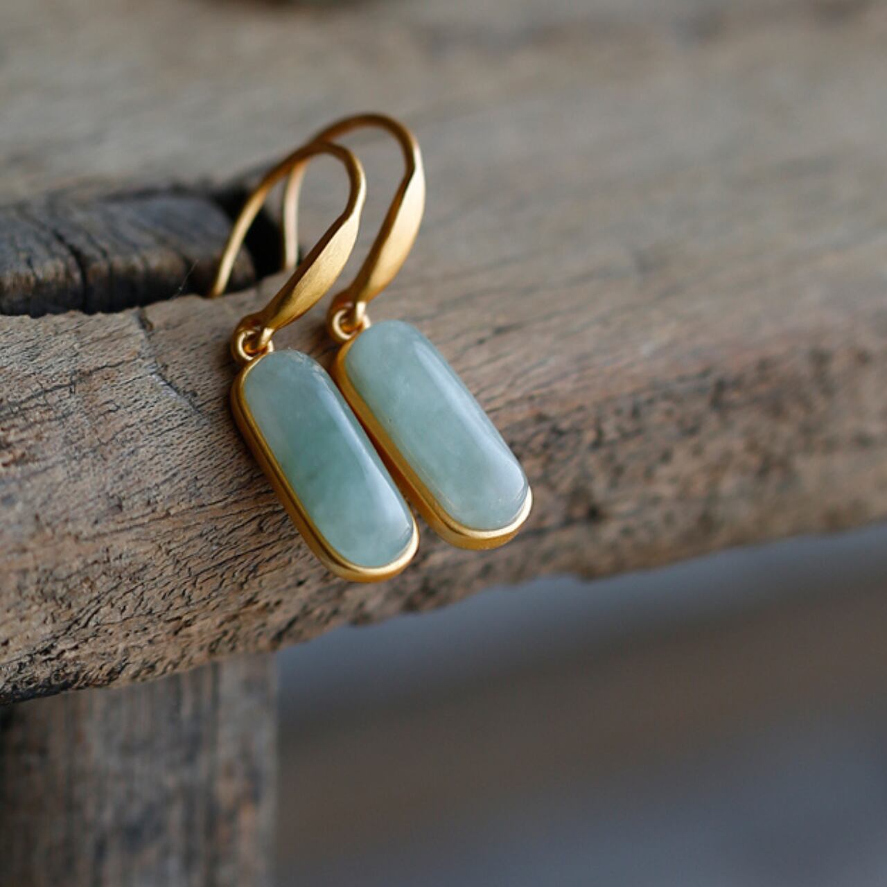 シンプルなデザインで、普段使いしやすい天然翡翠が埋め込まれたフック ドロップ型の ピアス。