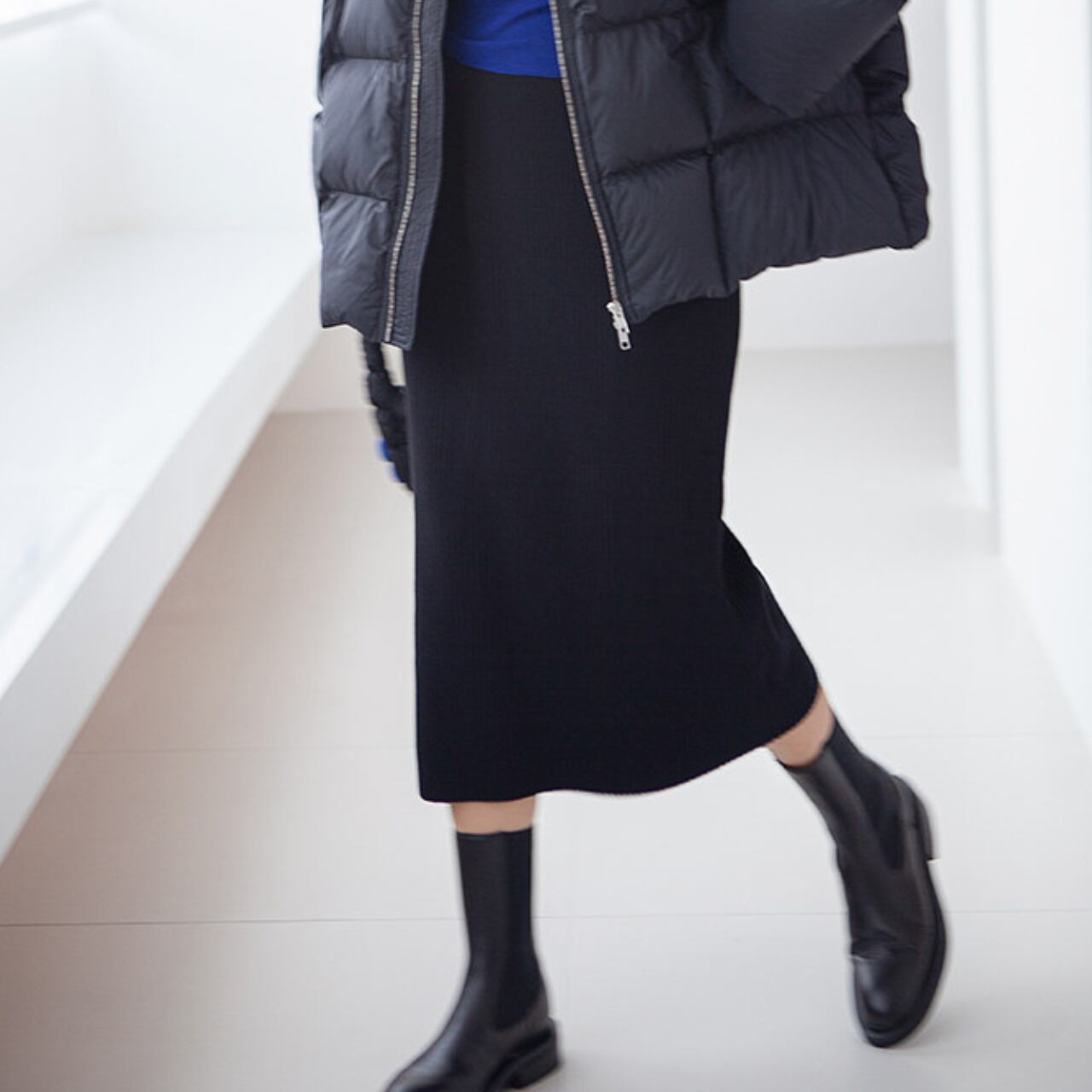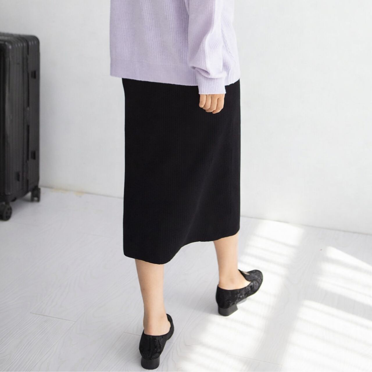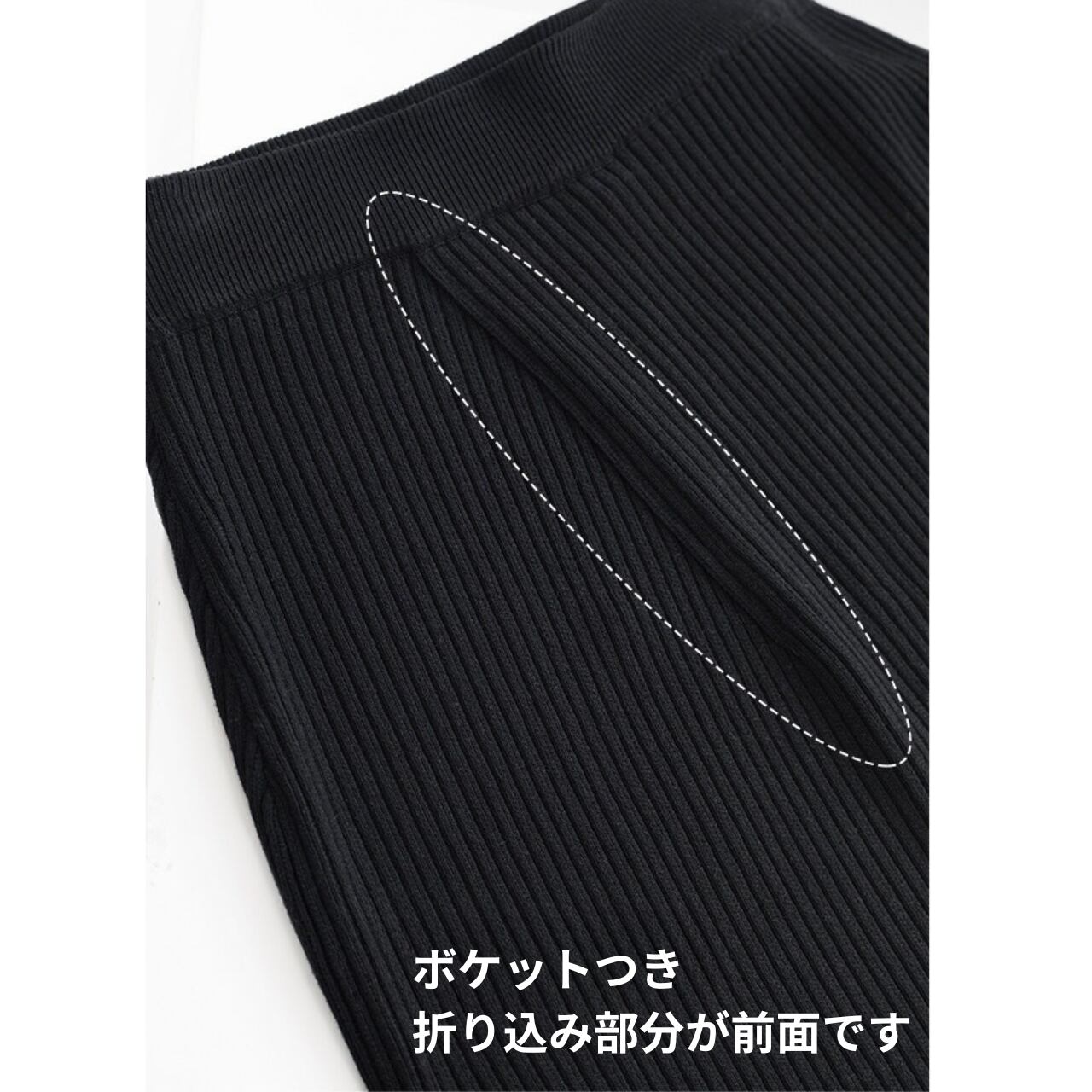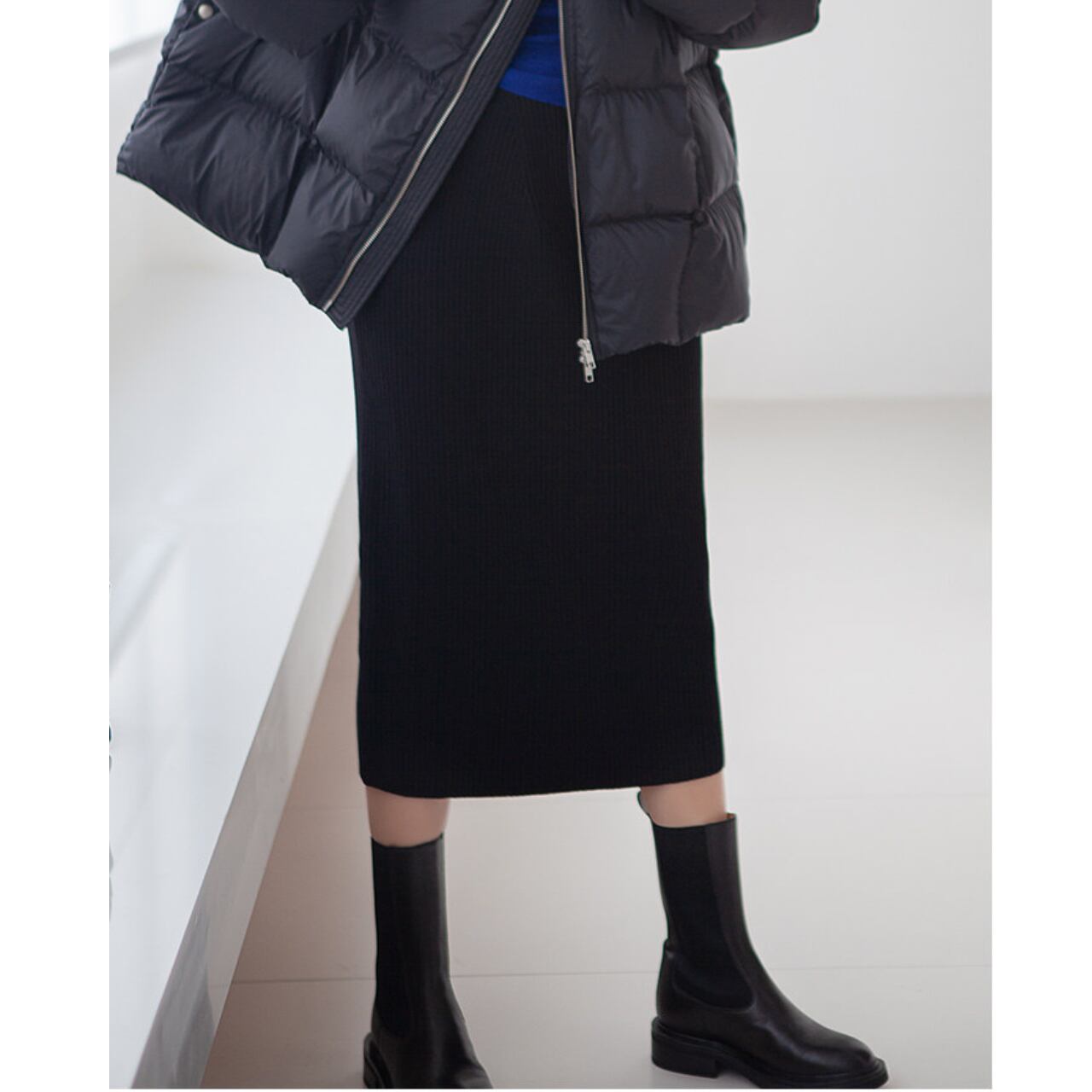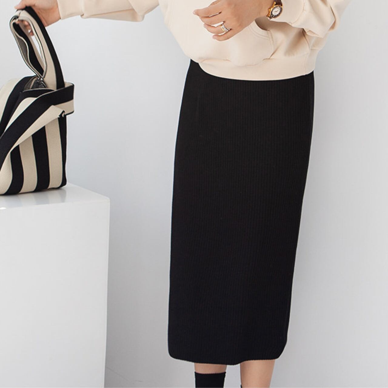 リブ編みの縦ラインが、スタイルをすっきりと見せてくれるミモレ丈のタイトスカート。