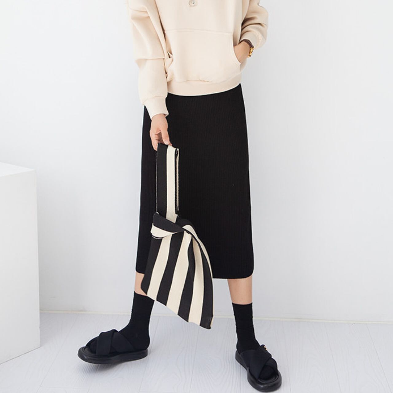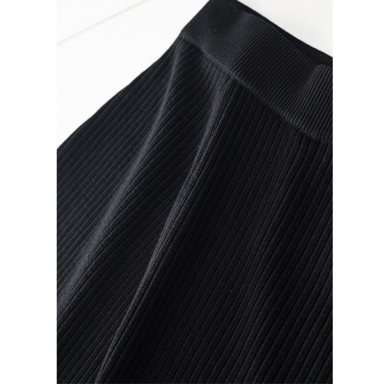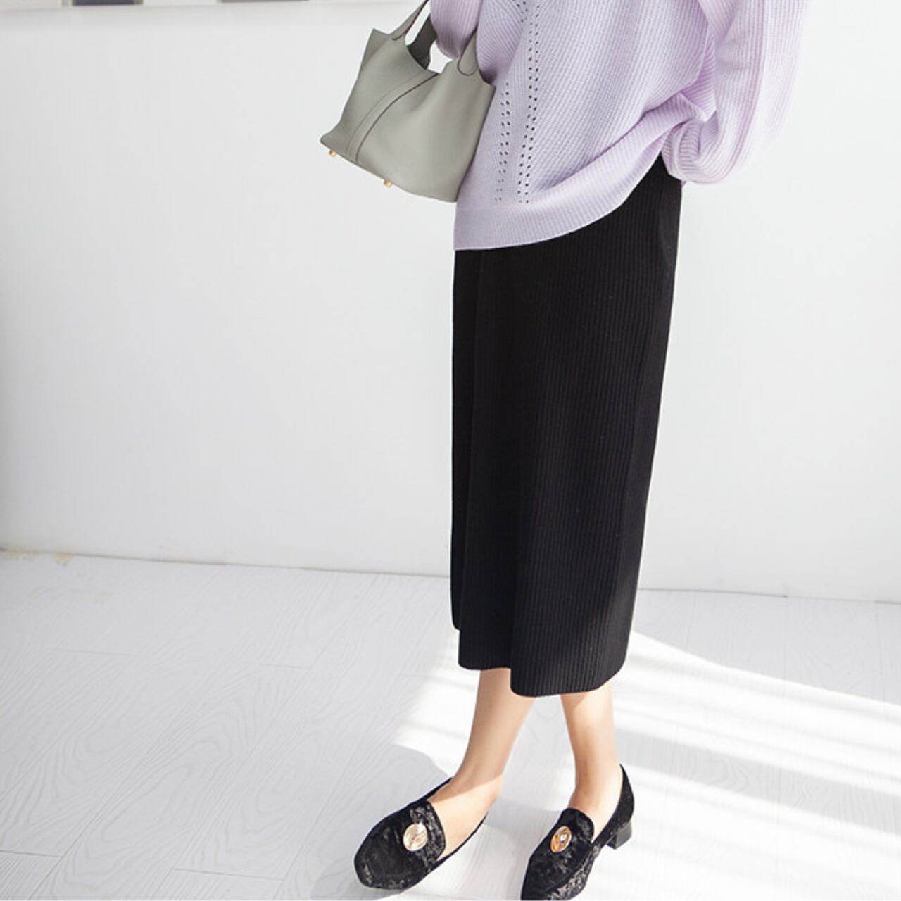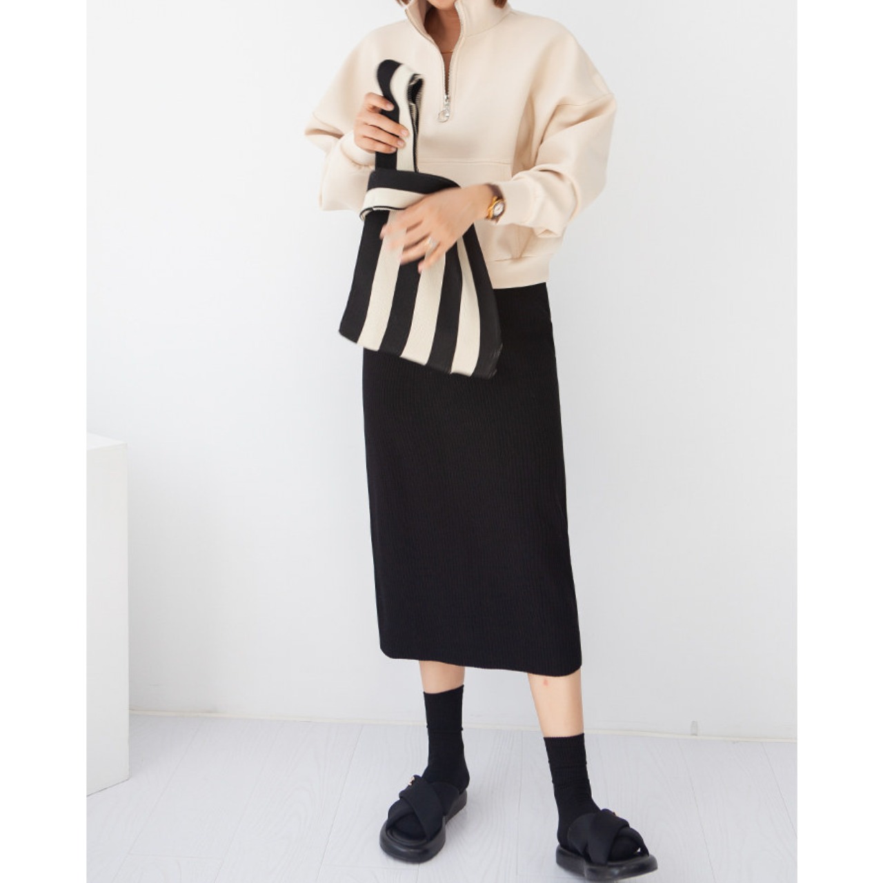 リブ編みの縦ラインが、スタイルをすっきりと見せてくれるミモレ丈のタイトスカート。
