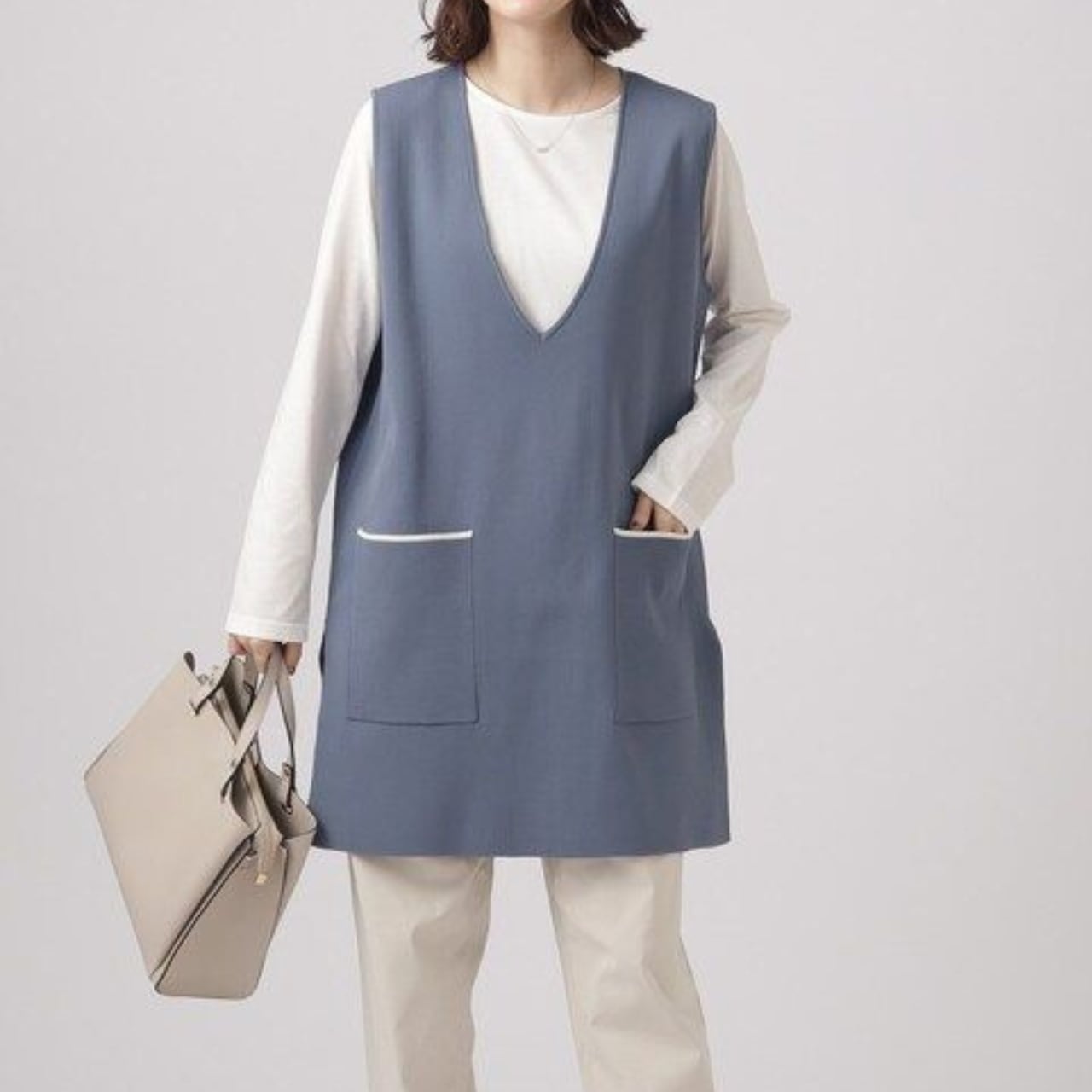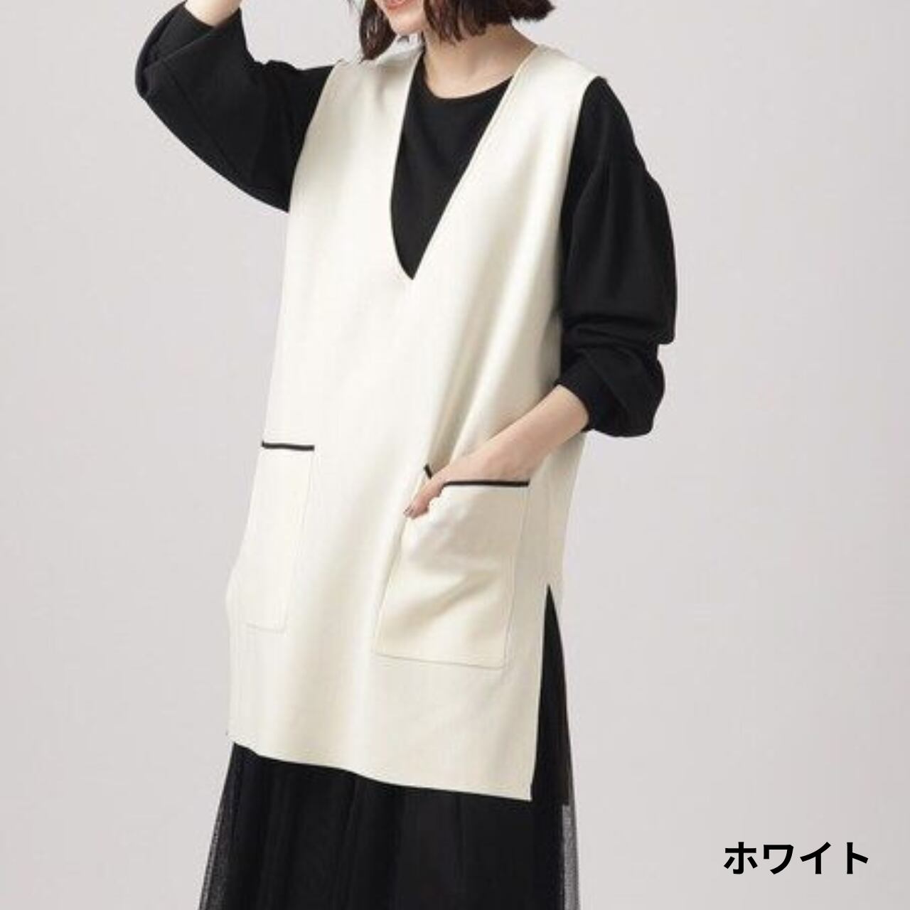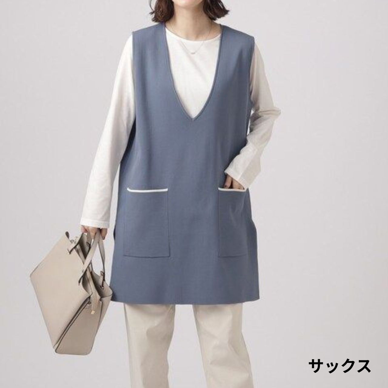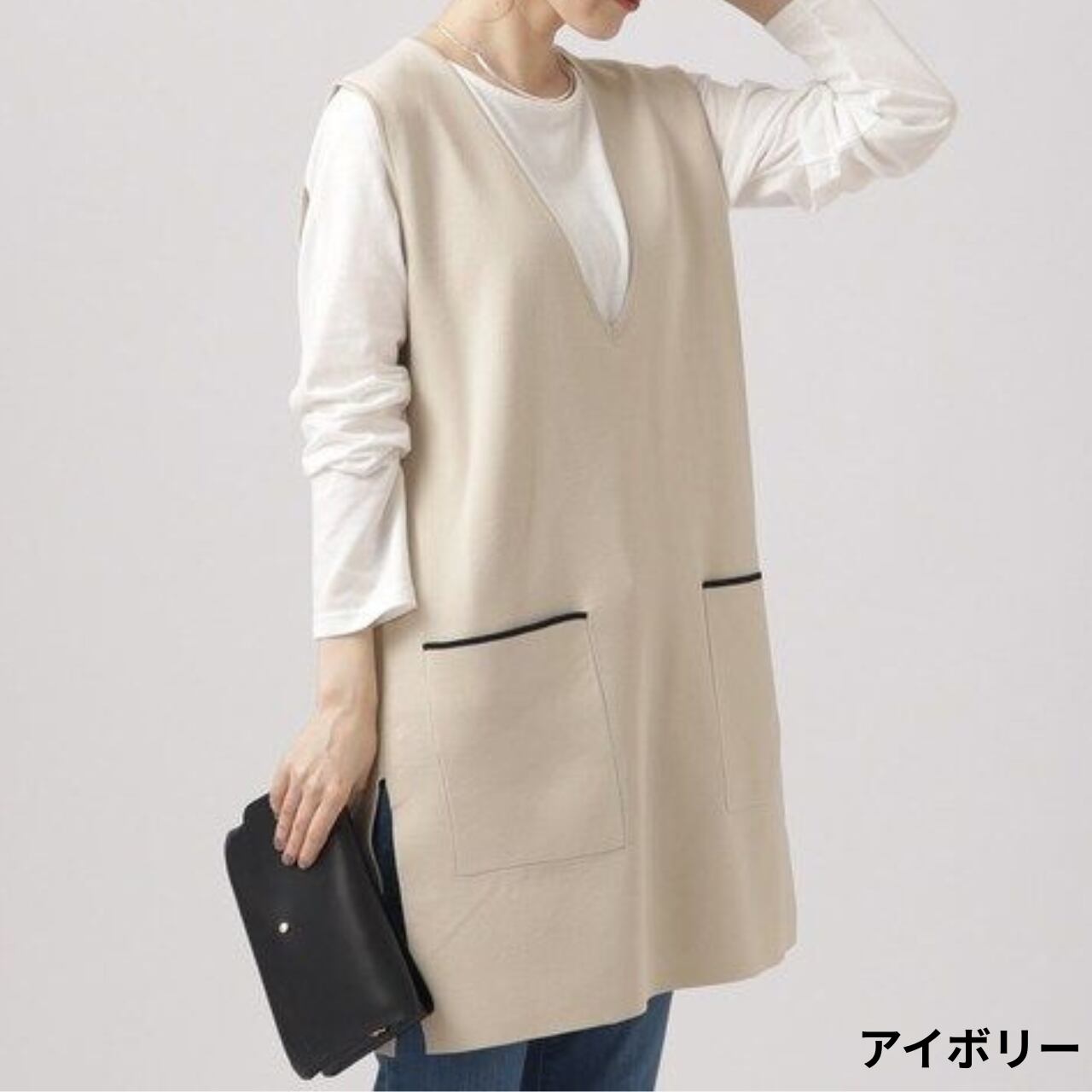 パッチポケット ミディ丈 Vネック ニットベスト / 00045