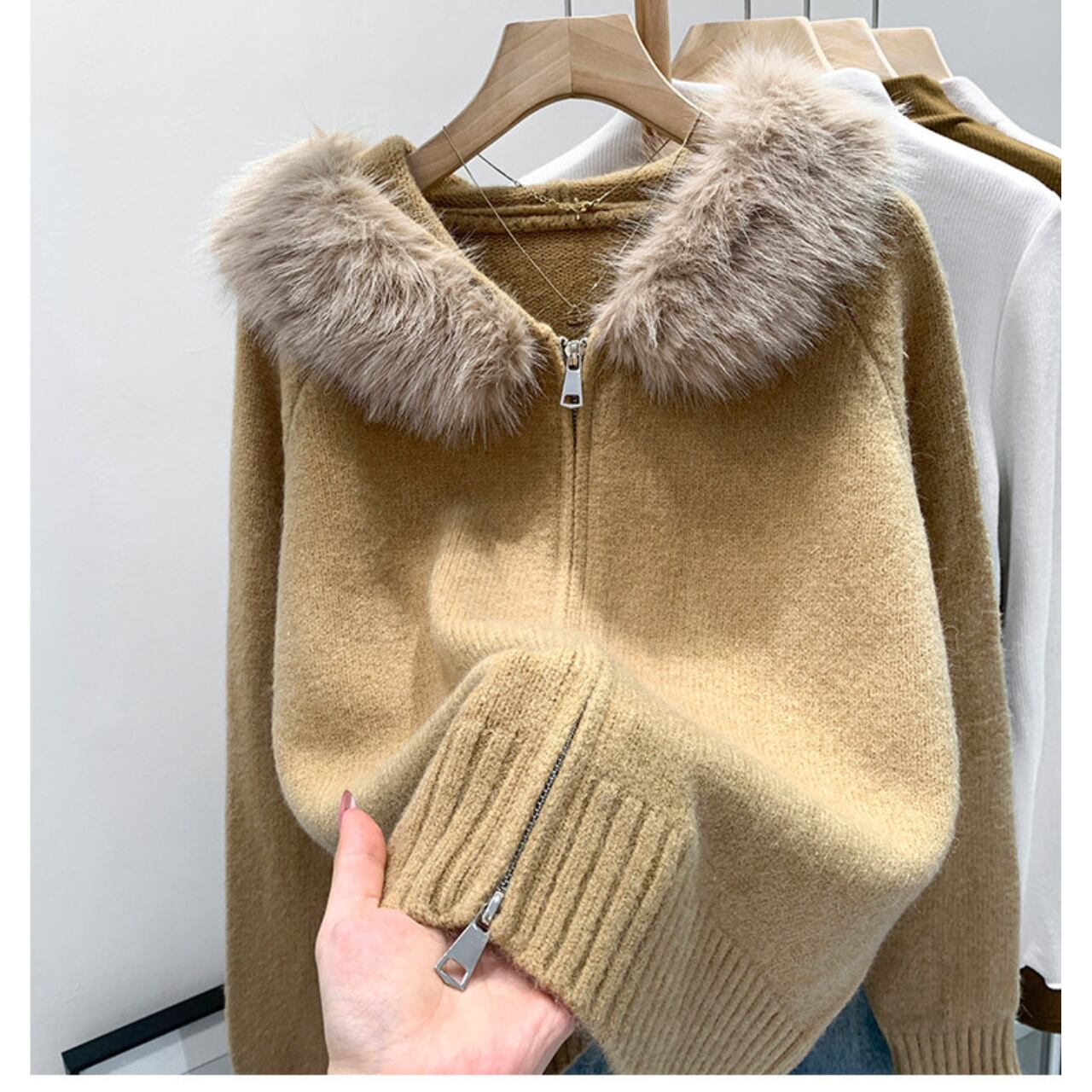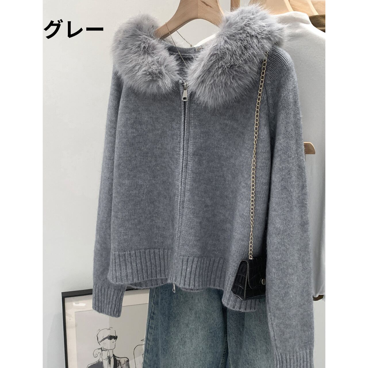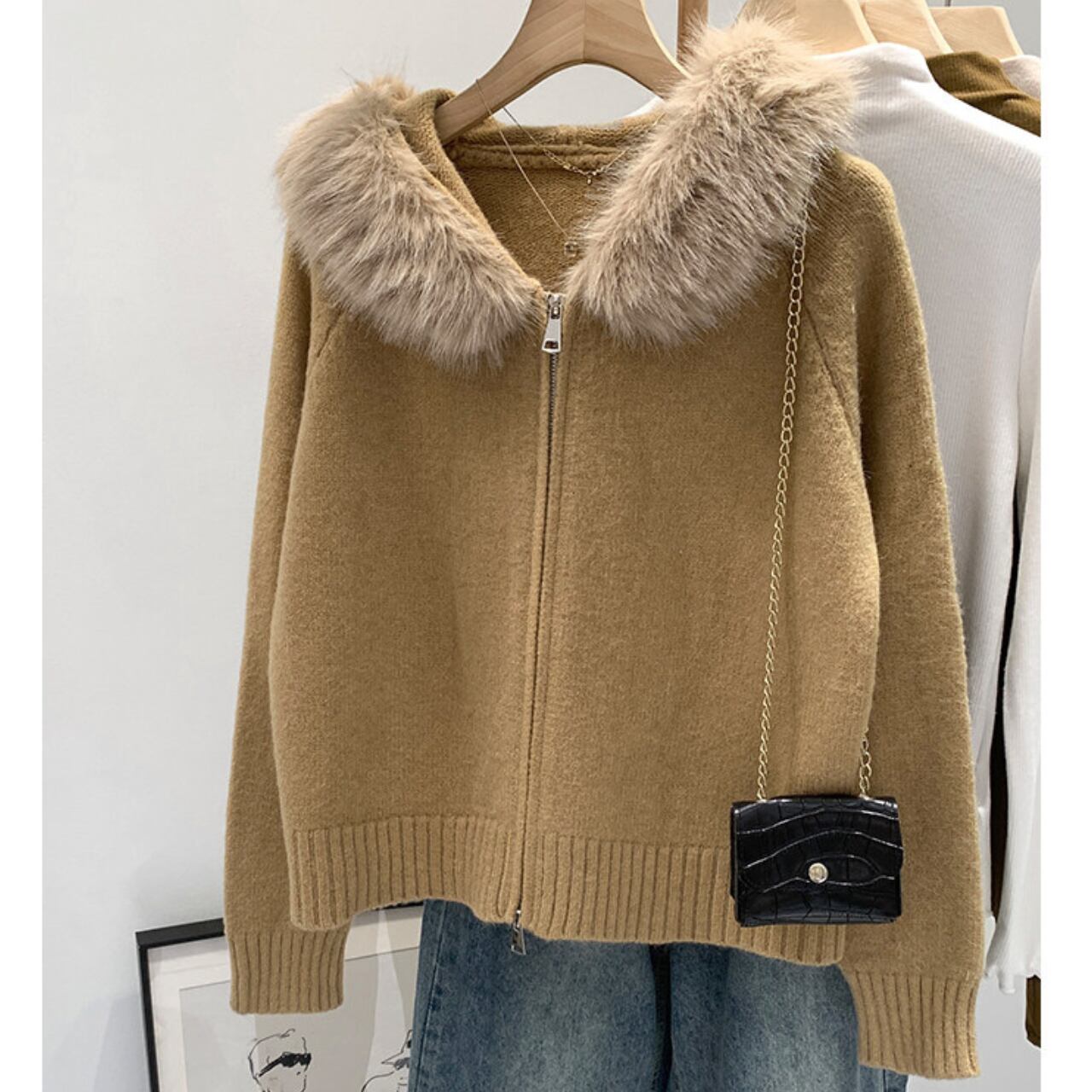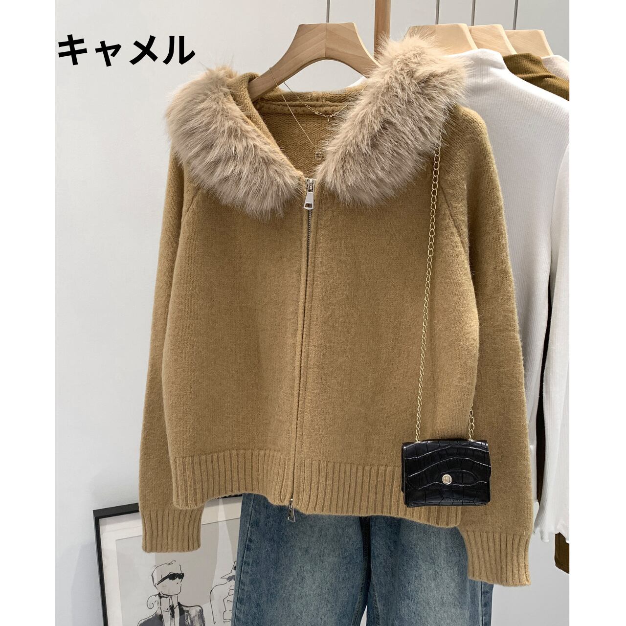 ファーカラー ジップアップ 長袖 ニットカーディガン / 00057