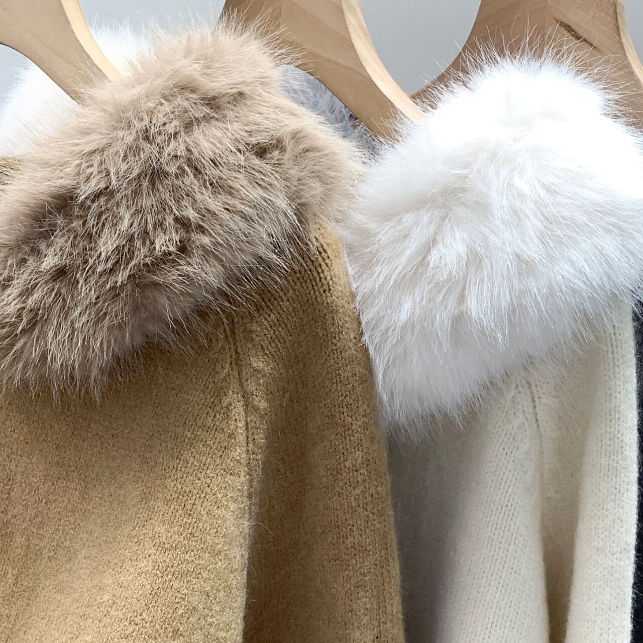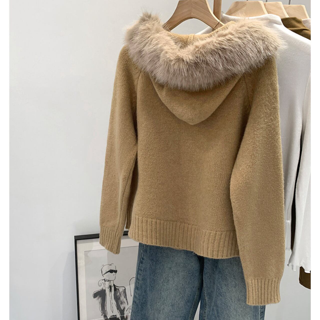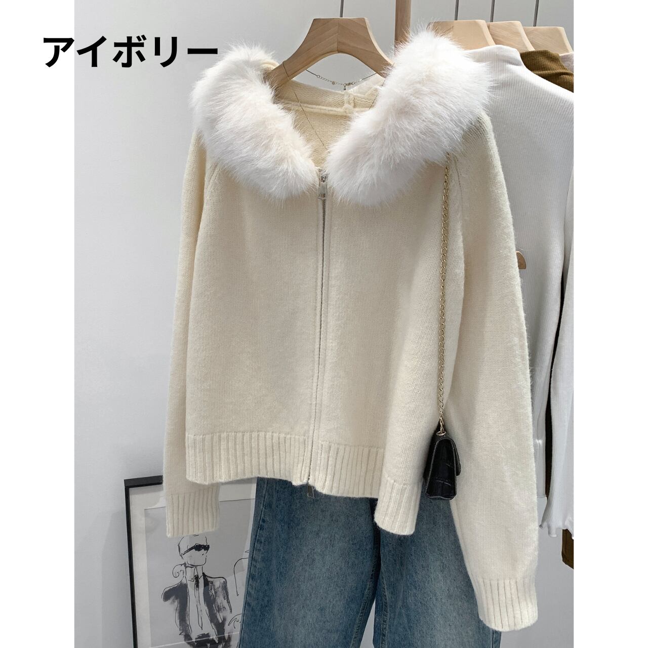 首元のファーが特徴的なニットカーディガン。ジップアップタイプで着脱しやすく、気軽に羽織れる普段使いしやすい一枚です。カジュアルな装いにも、ちょっとしたお出かけにも合わせやすいデザインです。