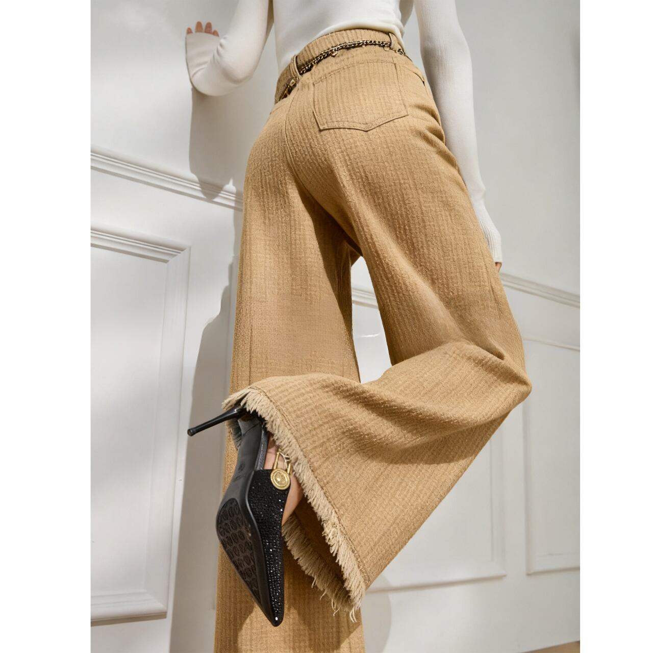 ハイウエストデザインが脚長効果を高め、スタイルアップを叶えます。裾のフリンジがアクセントとなり、普段のコーディネートに個性をプラスします。