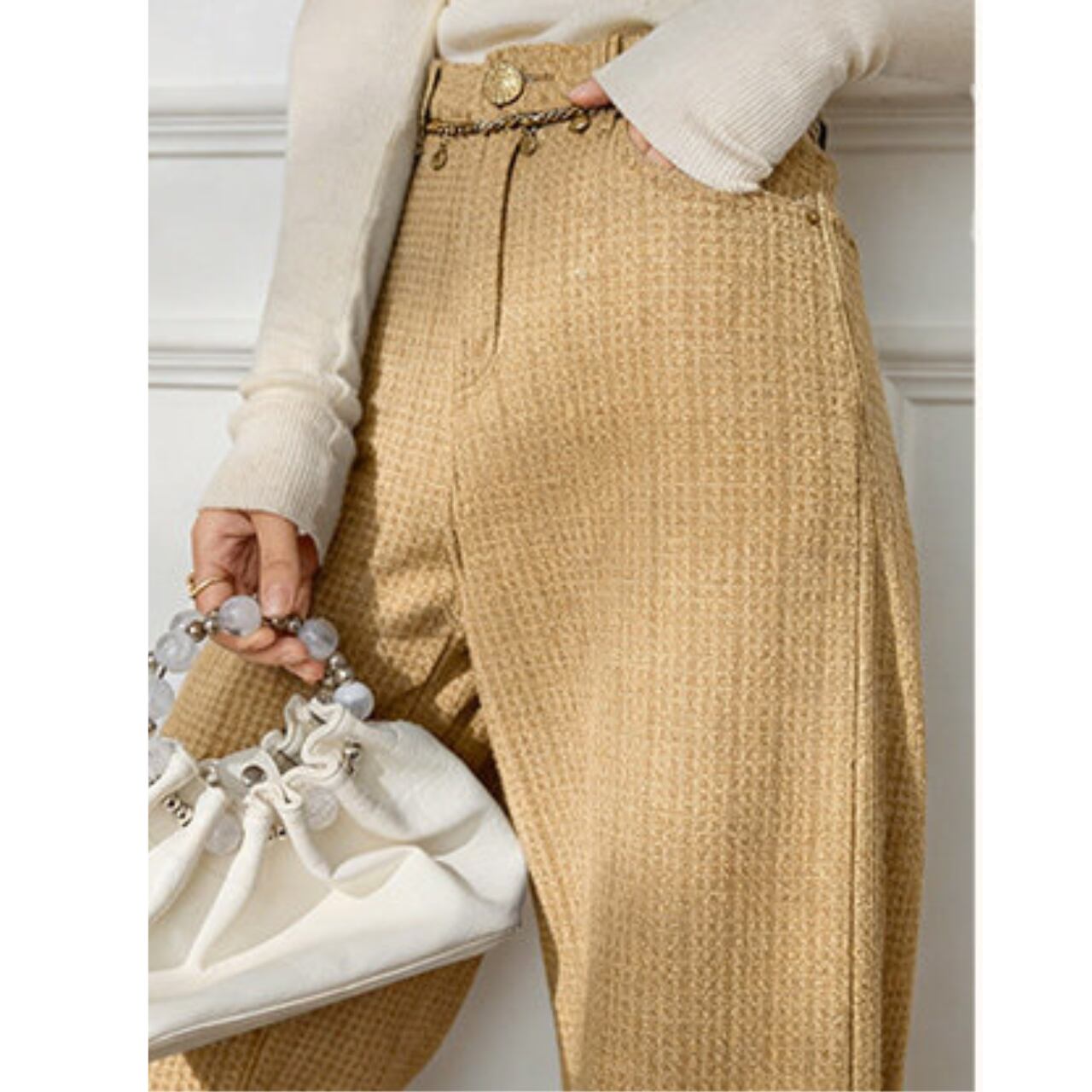 ワイドレッグシルエットがトレンド感を演出するパンツ。