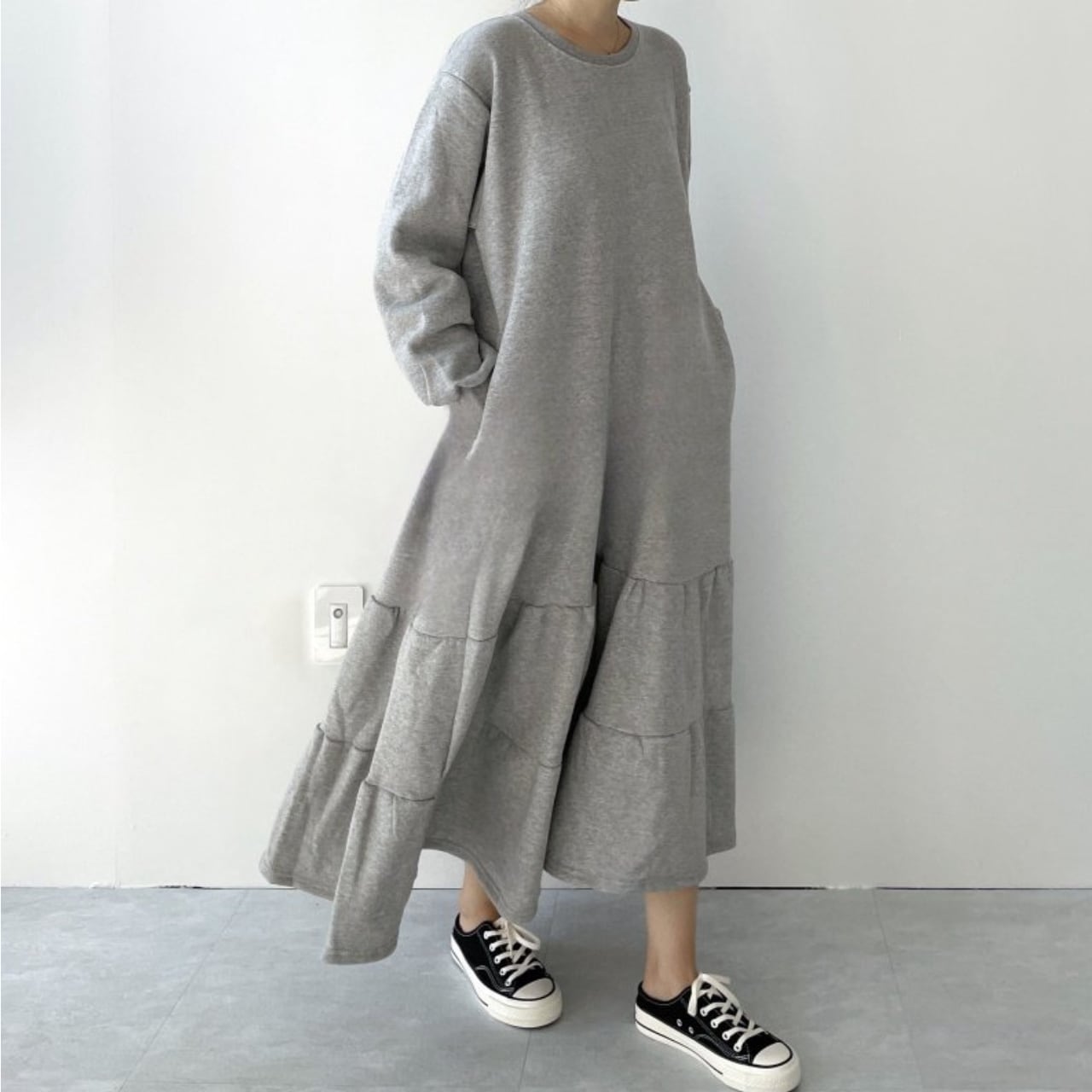 長袖 ティアード ミモレ丈 スウェット ワンピース / 00075