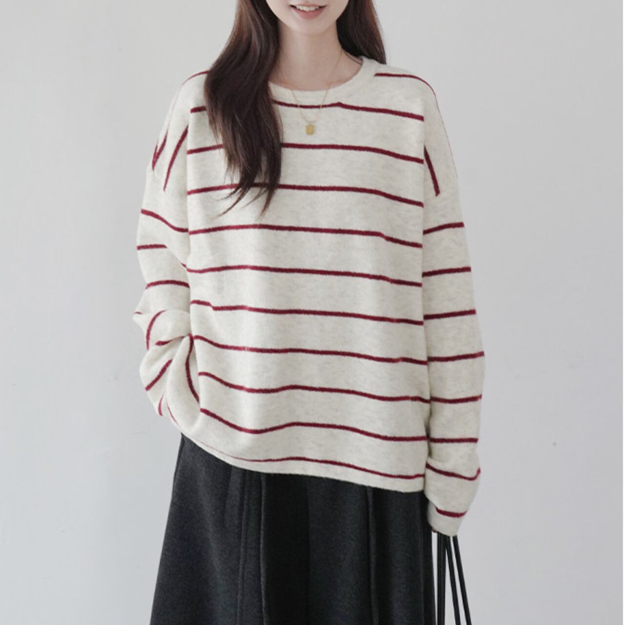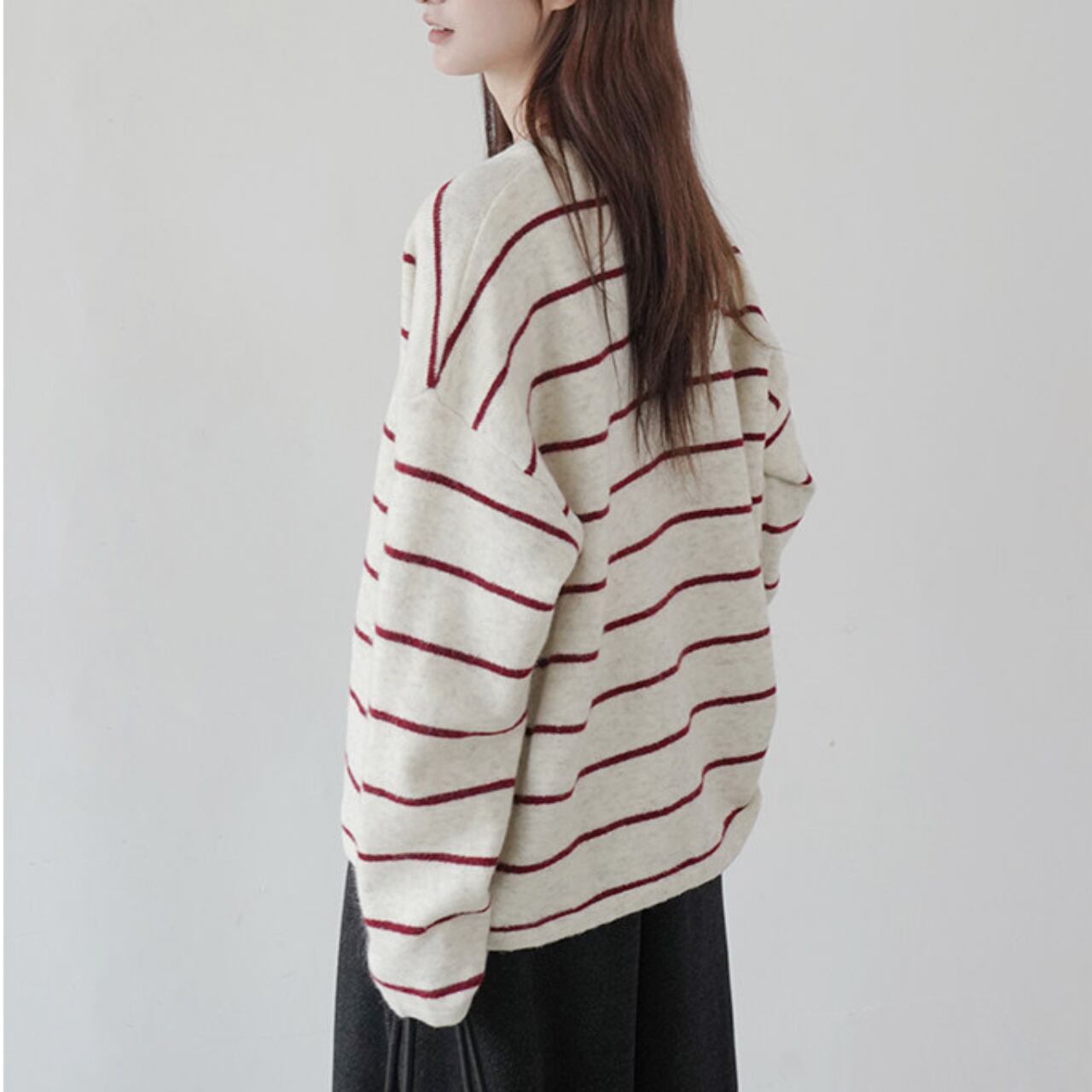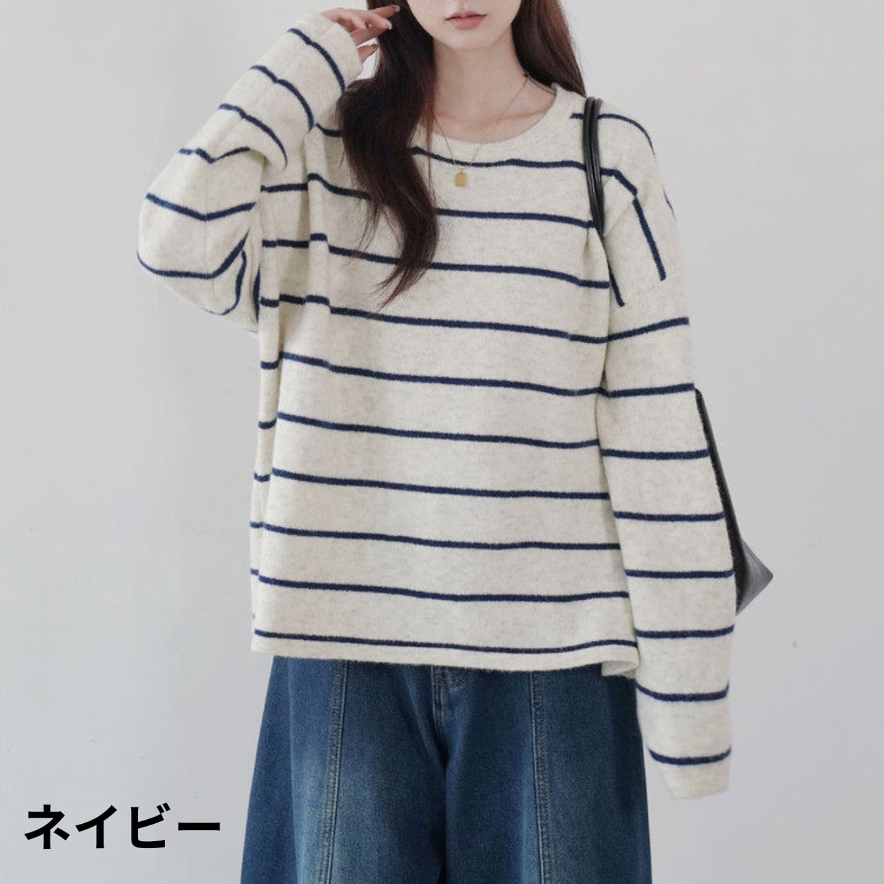 カジュアルな着こなしに最適な、ボーダー柄の長袖ニット。ヒップ丈のデザインで、様々なボトムスと合わせやすく、普段使いに活躍します。シンプルながらも存在感のあるアイテムです。