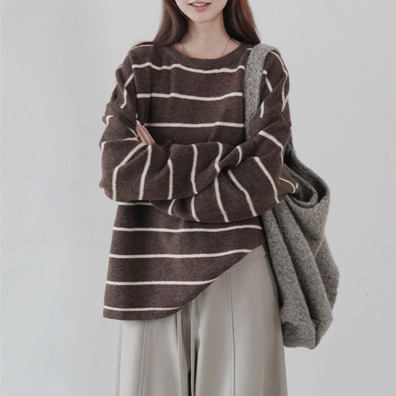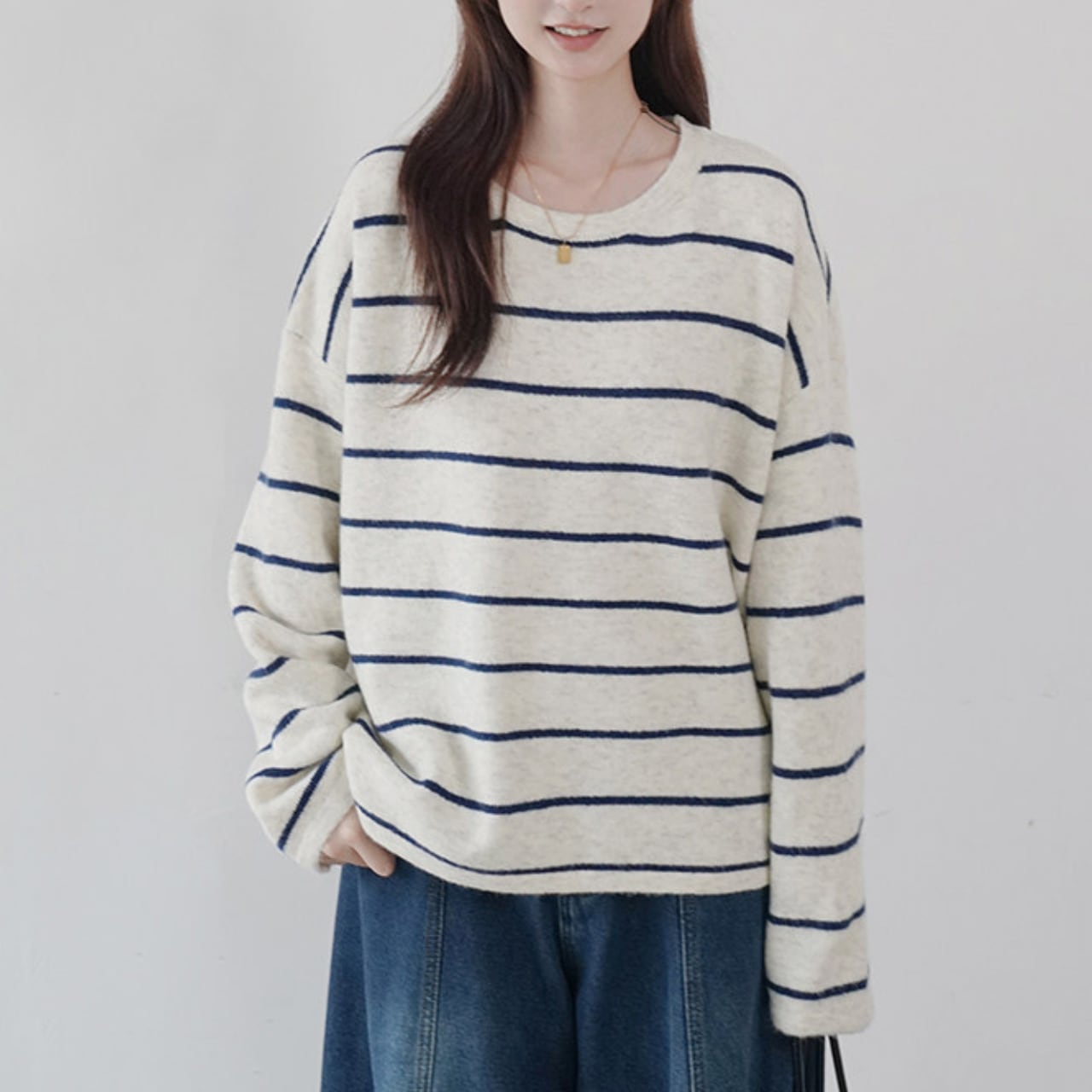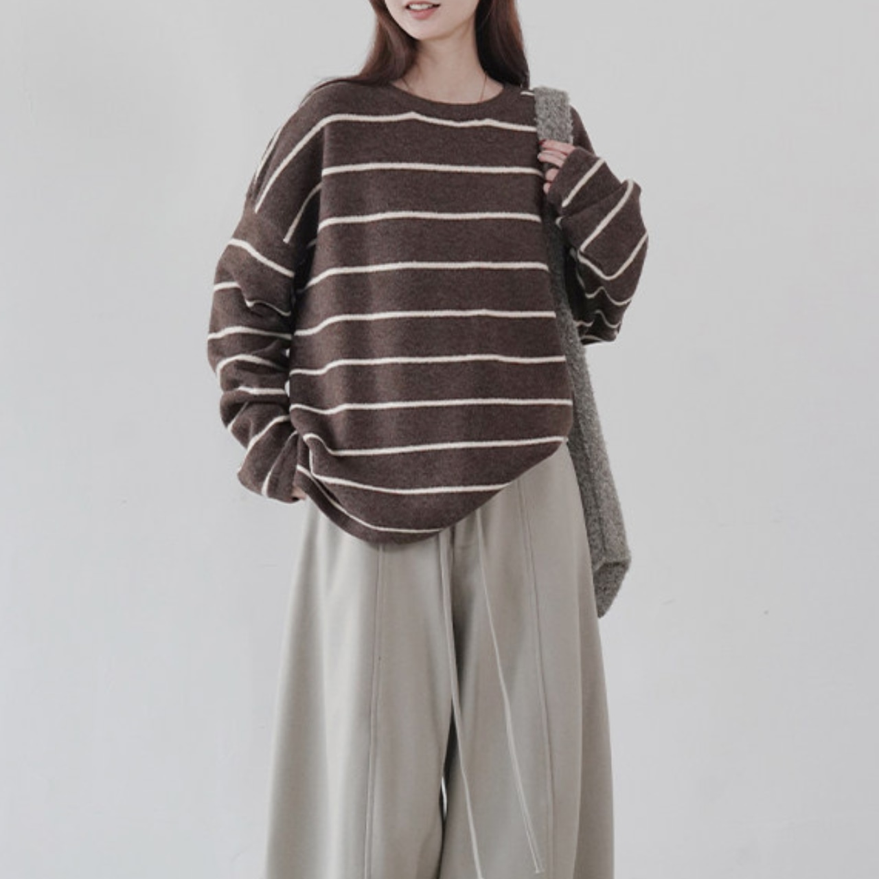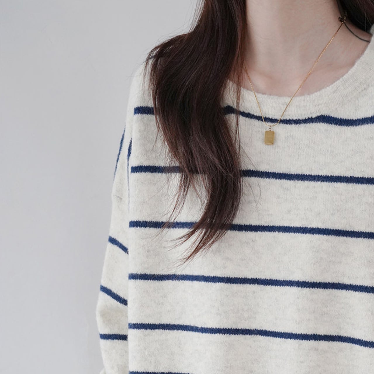 カジュアルな着こなしに最適な、ボーダー柄の長袖ニット。ヒップ丈のデザインで、様々なボトムスと合わせやすく、普段使いに活躍します。シンプルながらも存在感のあるアイテムです。