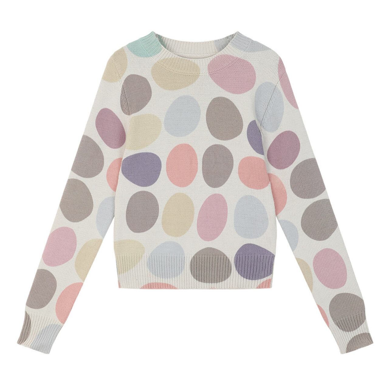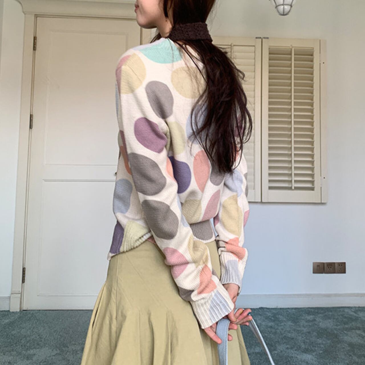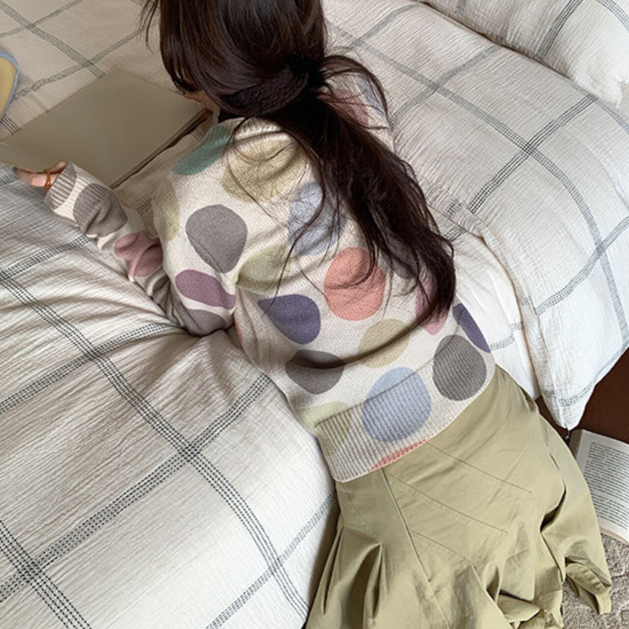 ボタンフロント ヒップ丈 長袖 ドット柄 セーター / 00090
