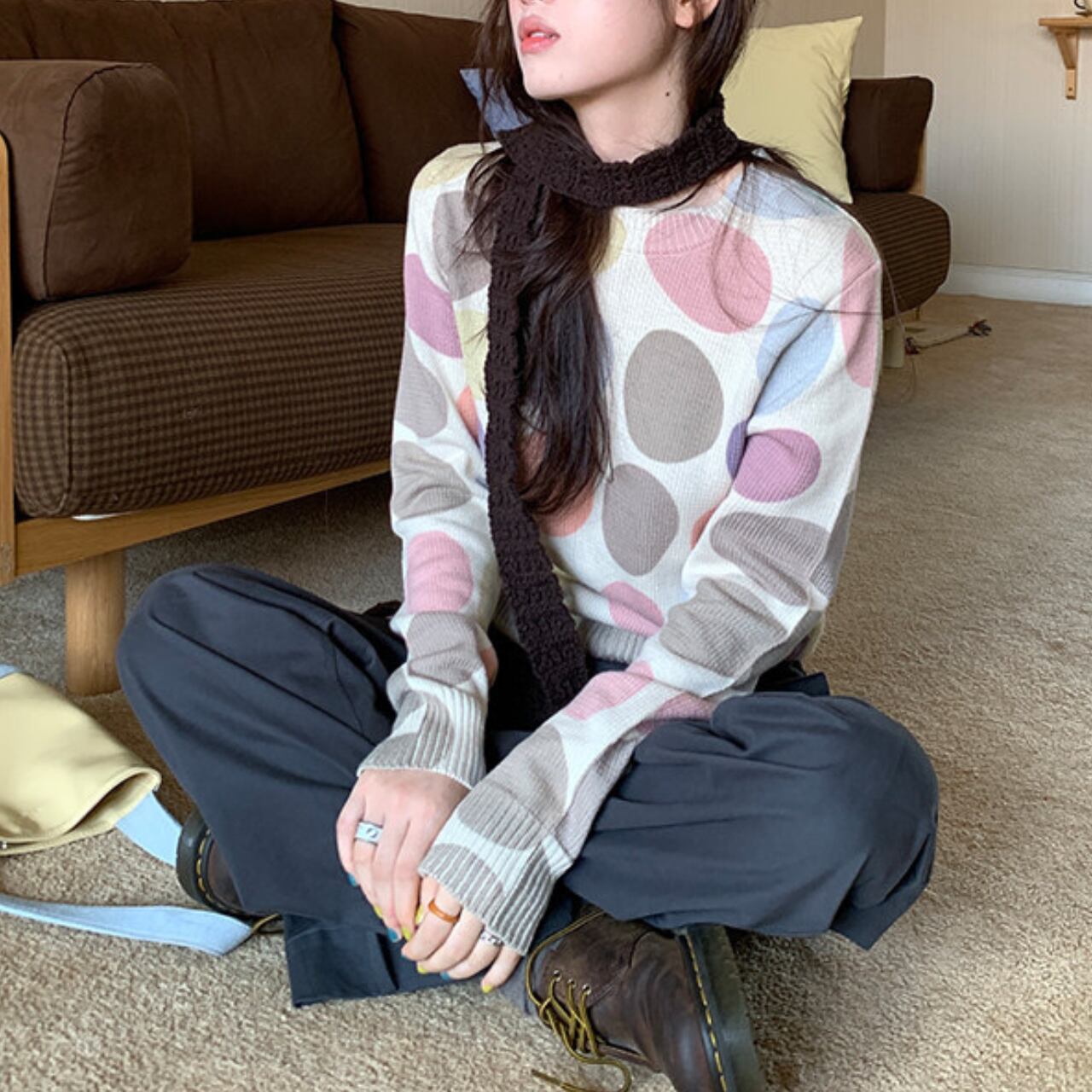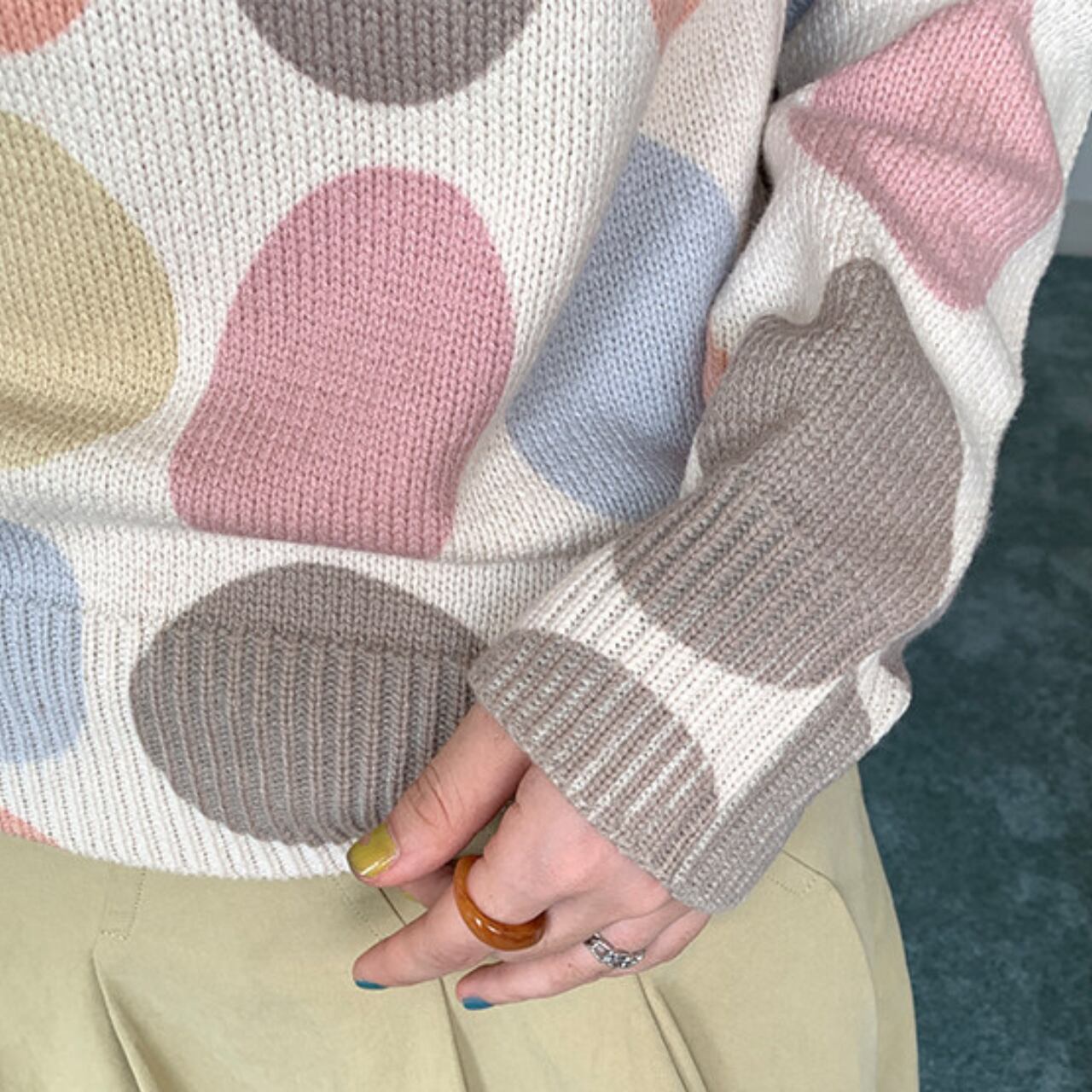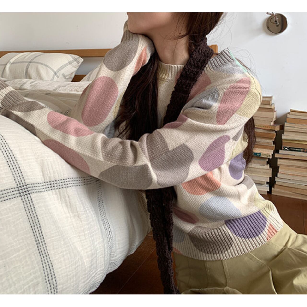 ボタンフロント ヒップ丈 長袖 ドット柄 セーター / 00090