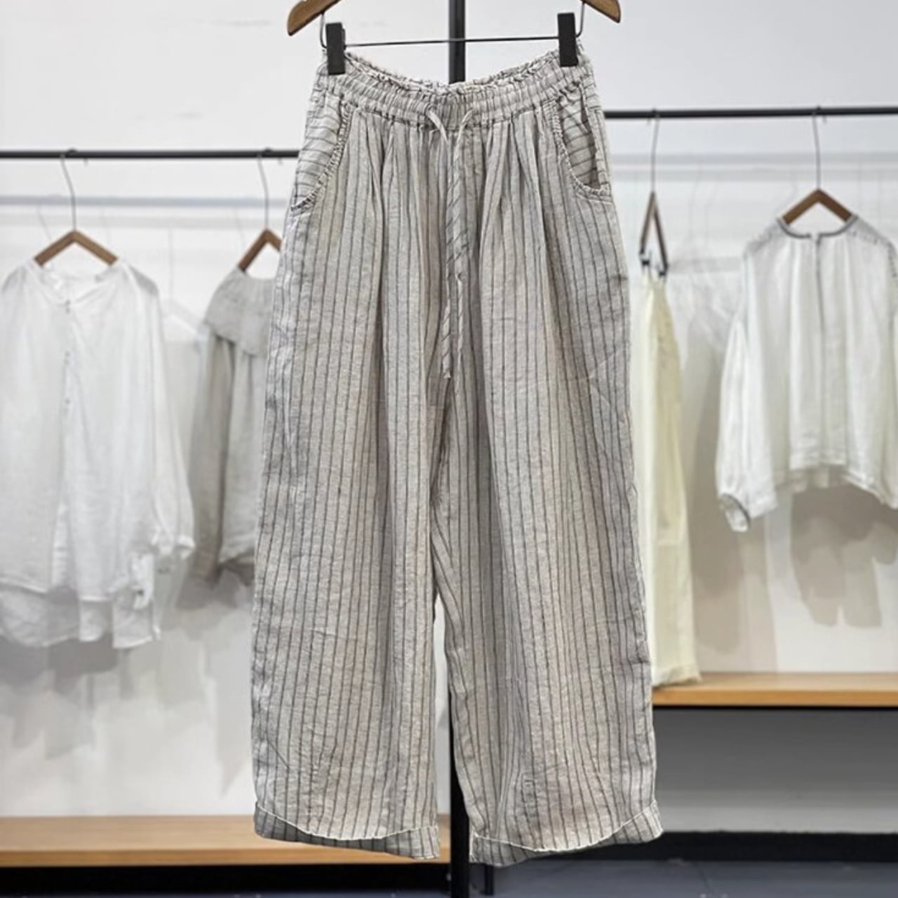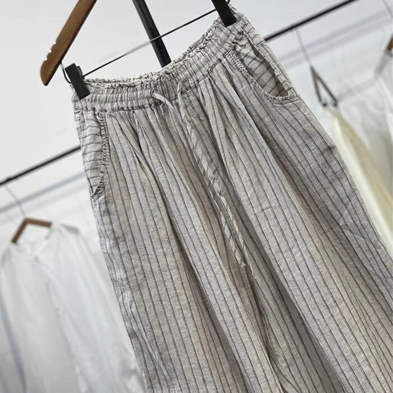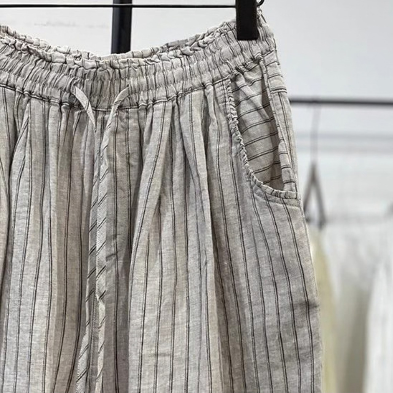 ストライプ柄が爽やかな印象を与えるワイドパンツ。