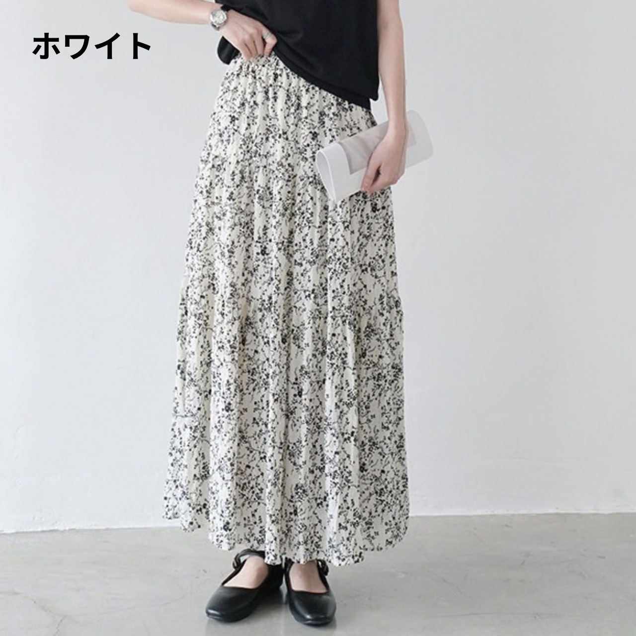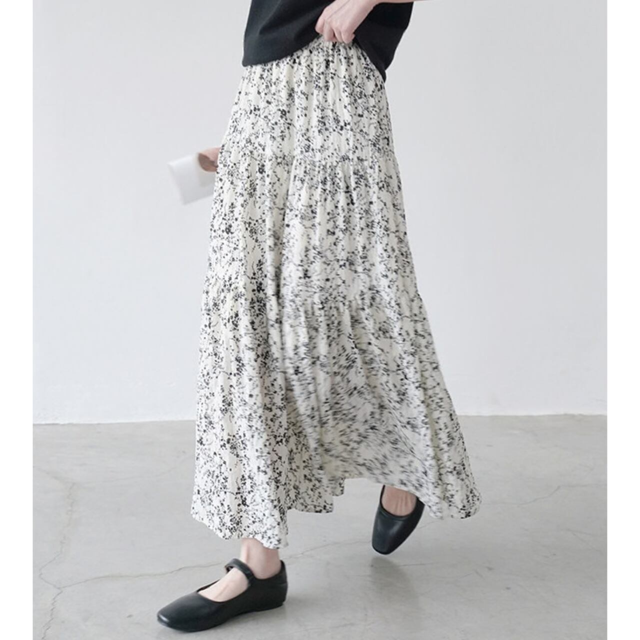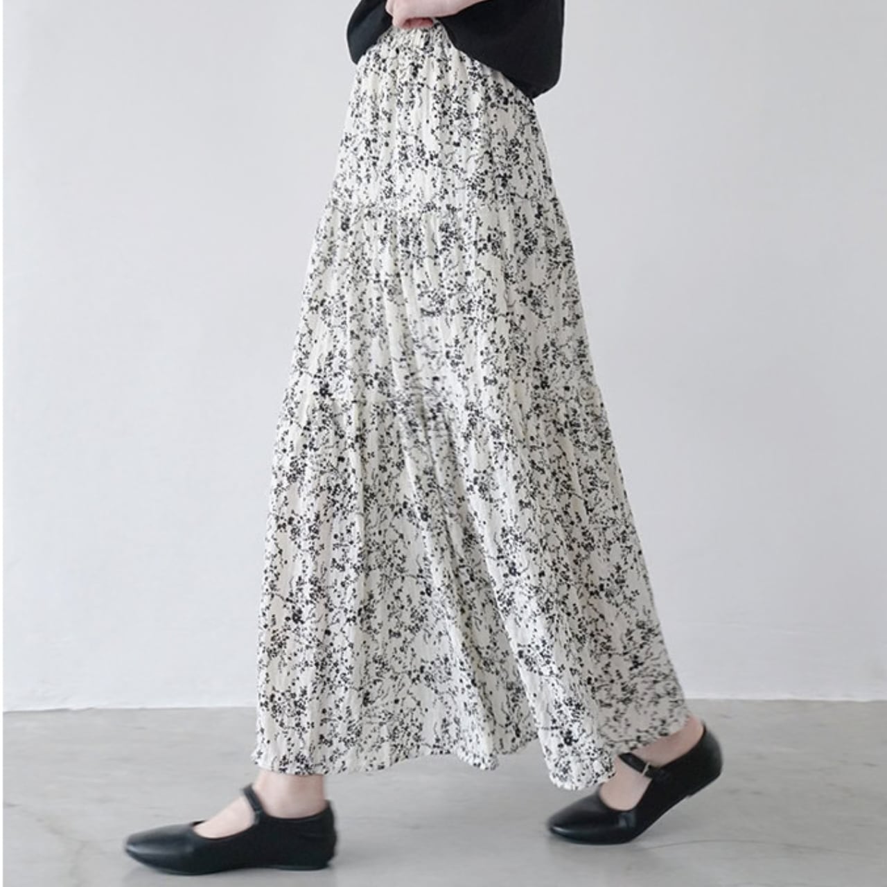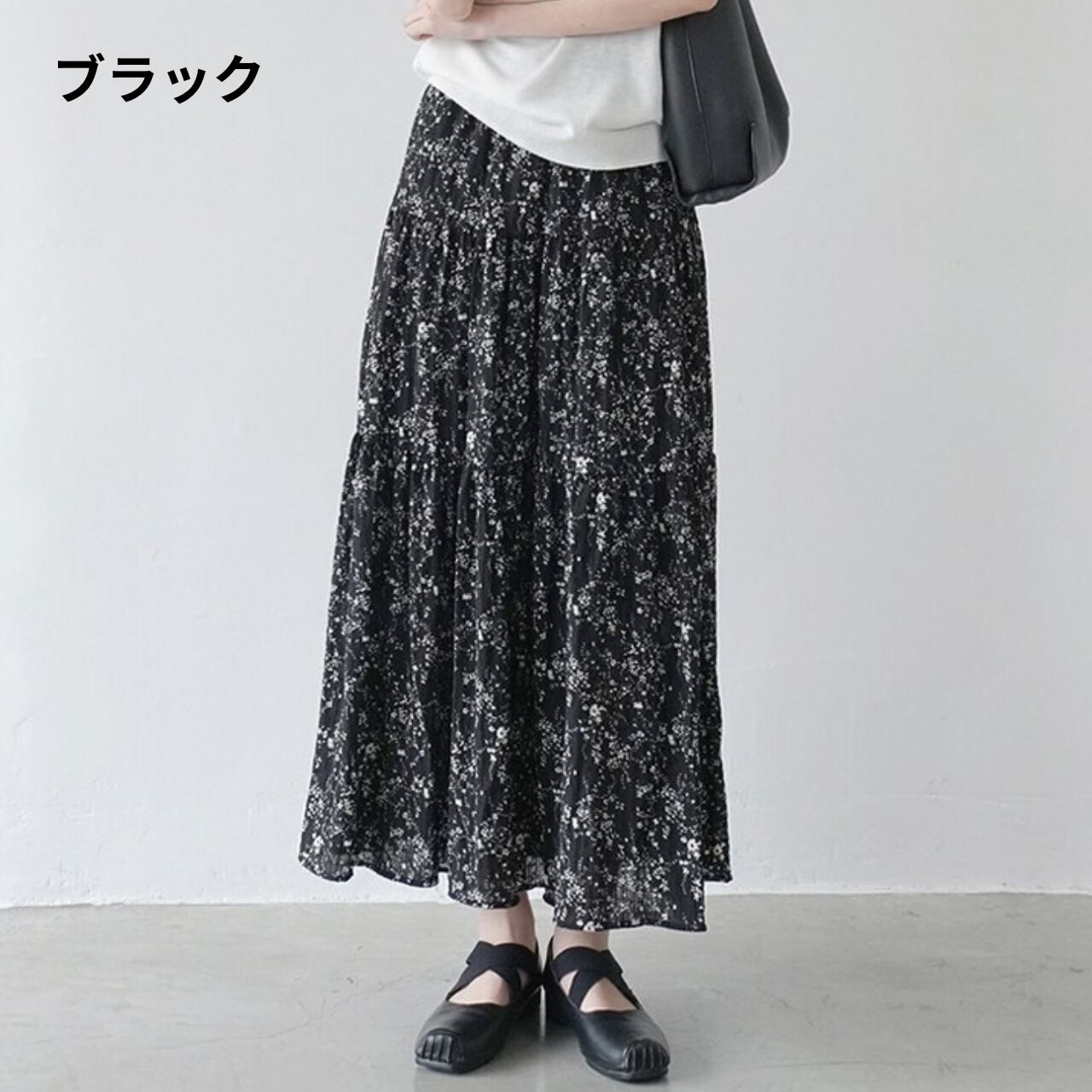 軽やかなフラワープリントが目を引くマキシ丈スカート。