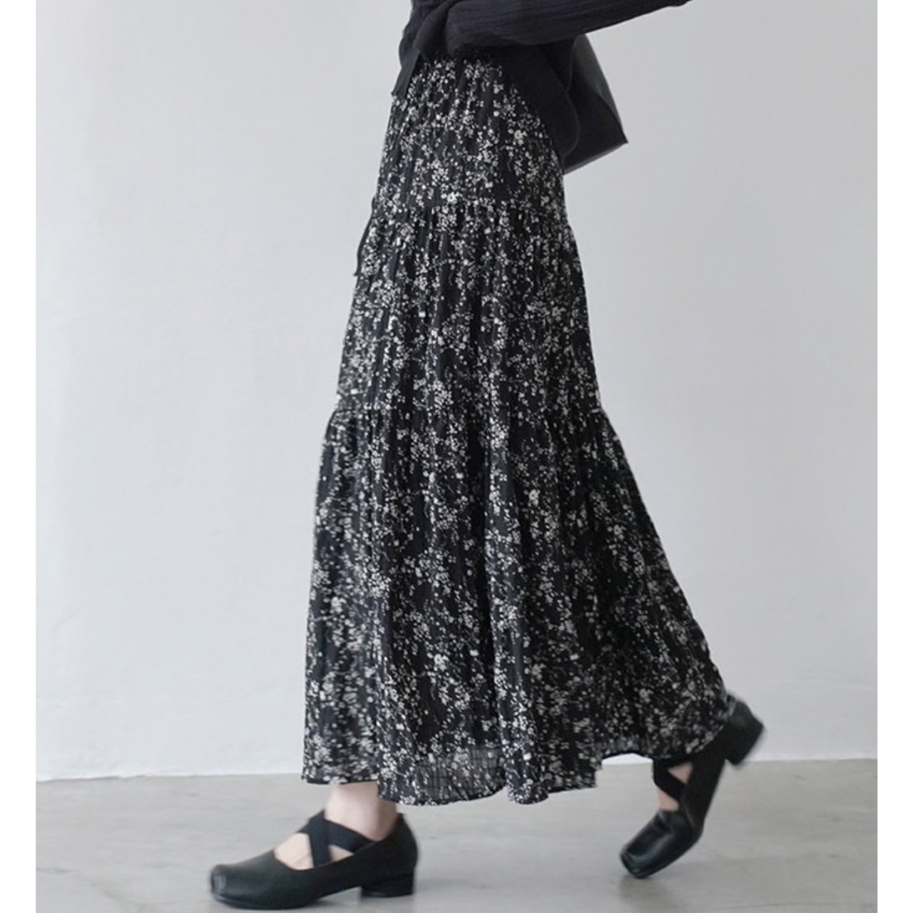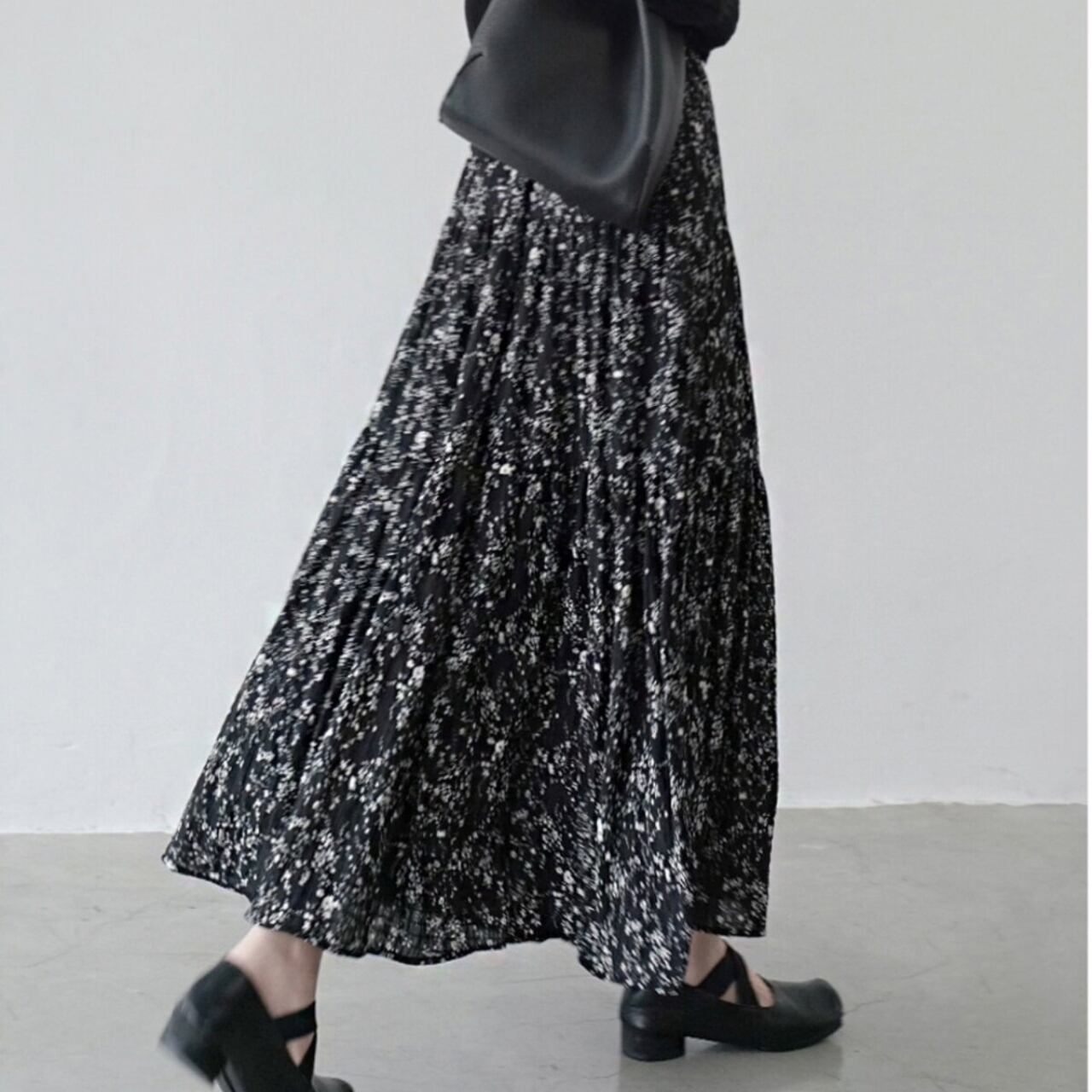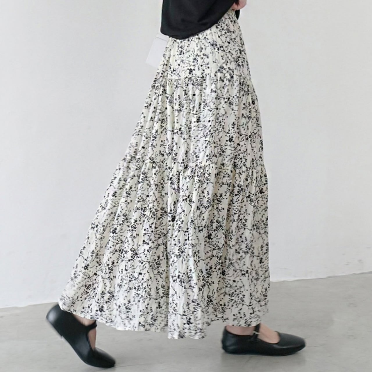 軽やかなフラワープリントが目を引くマキシ丈スカート。