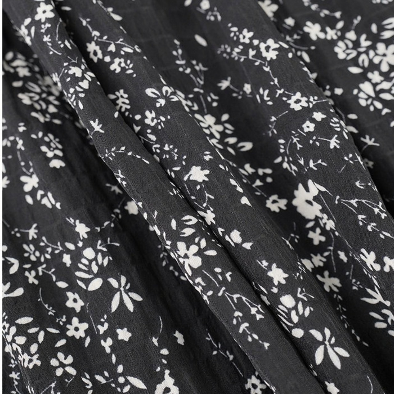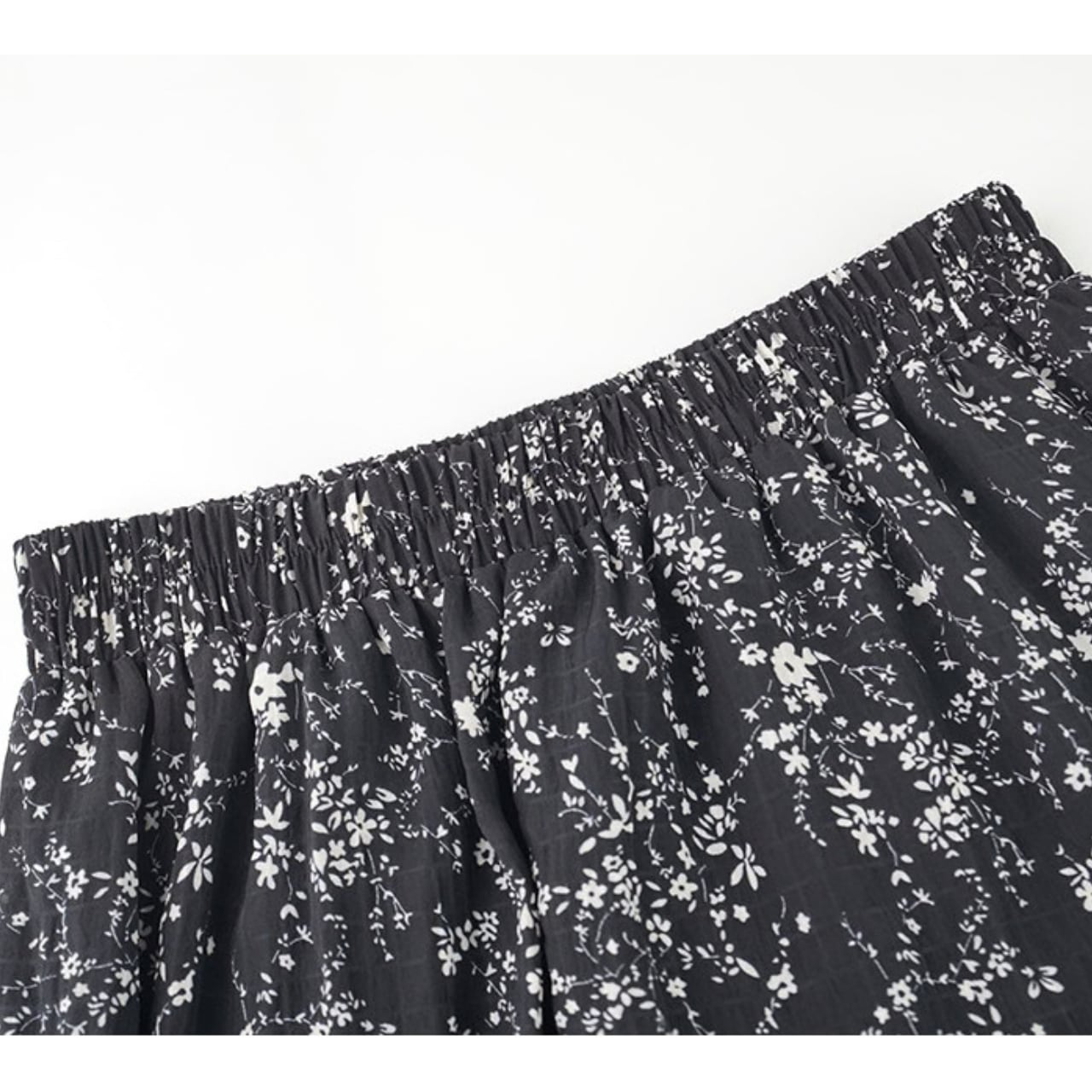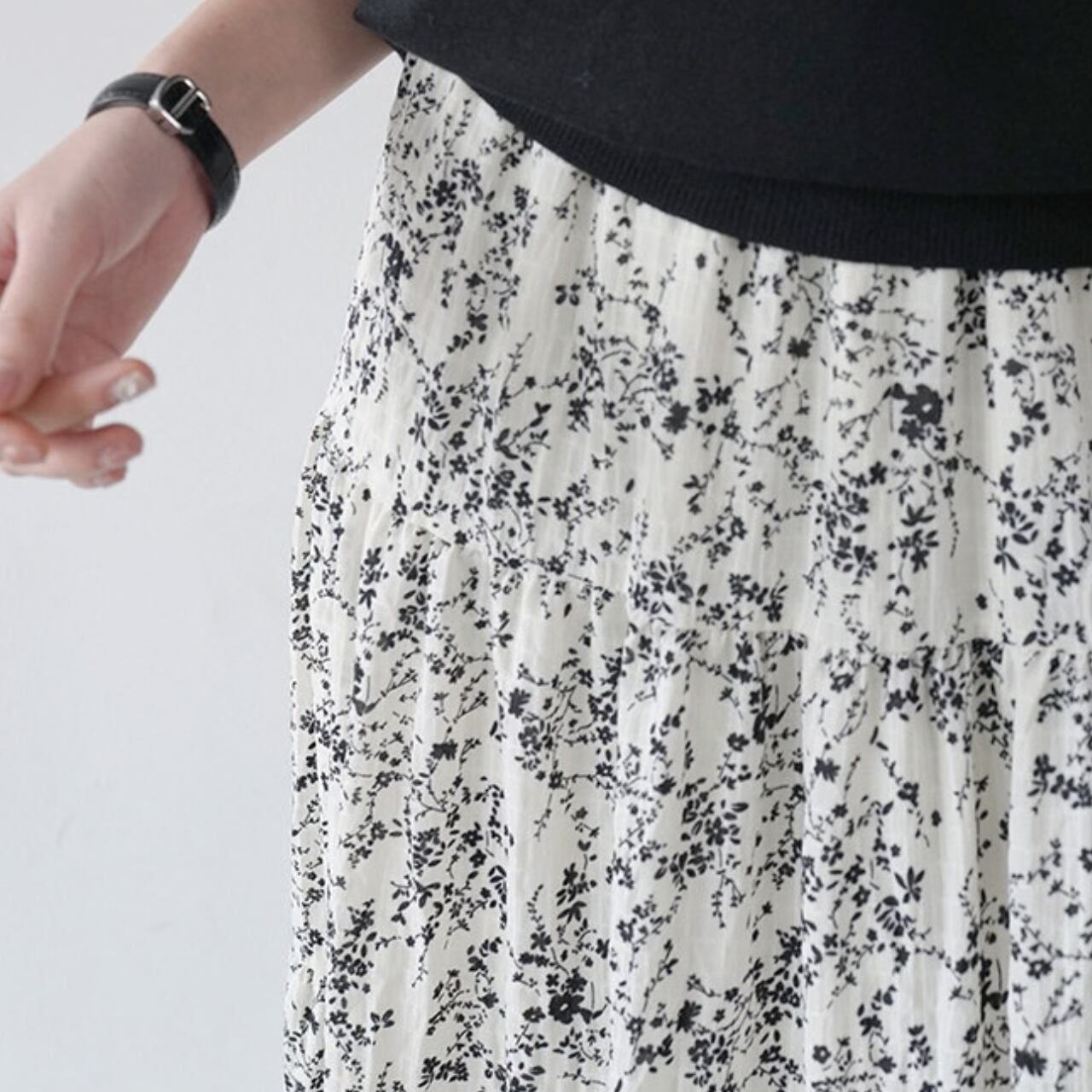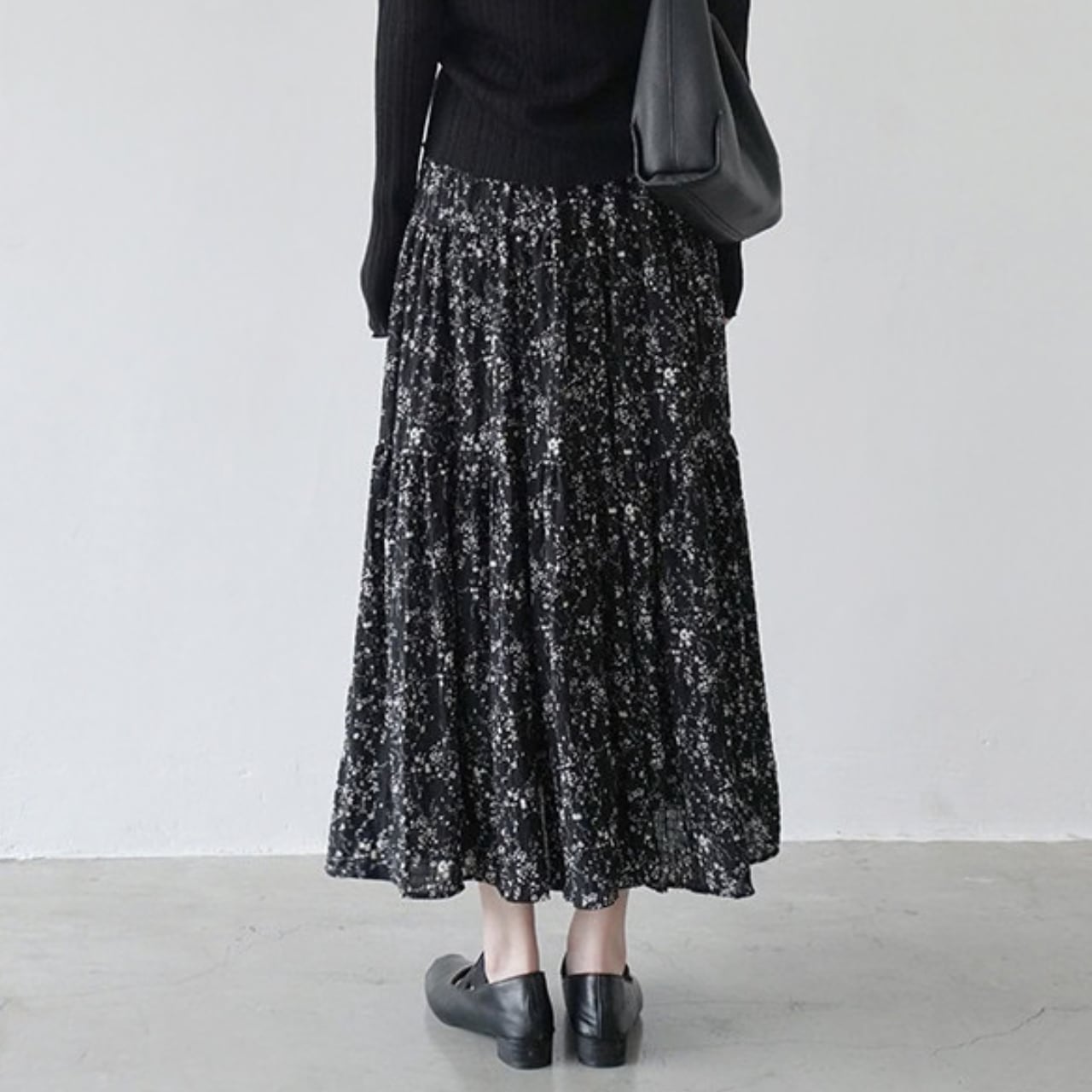 軽やかなフラワープリントが目を引くマキシ丈スカート。