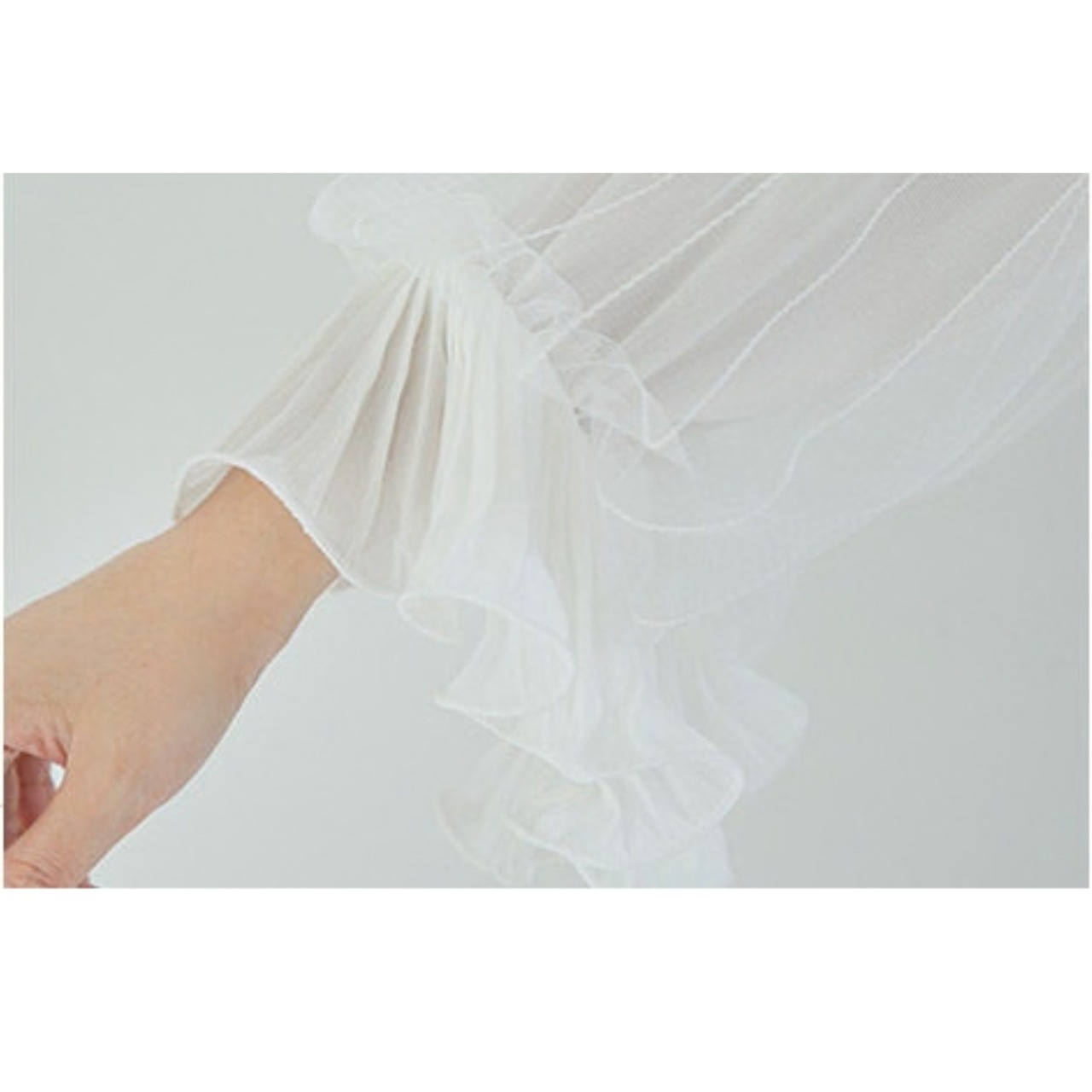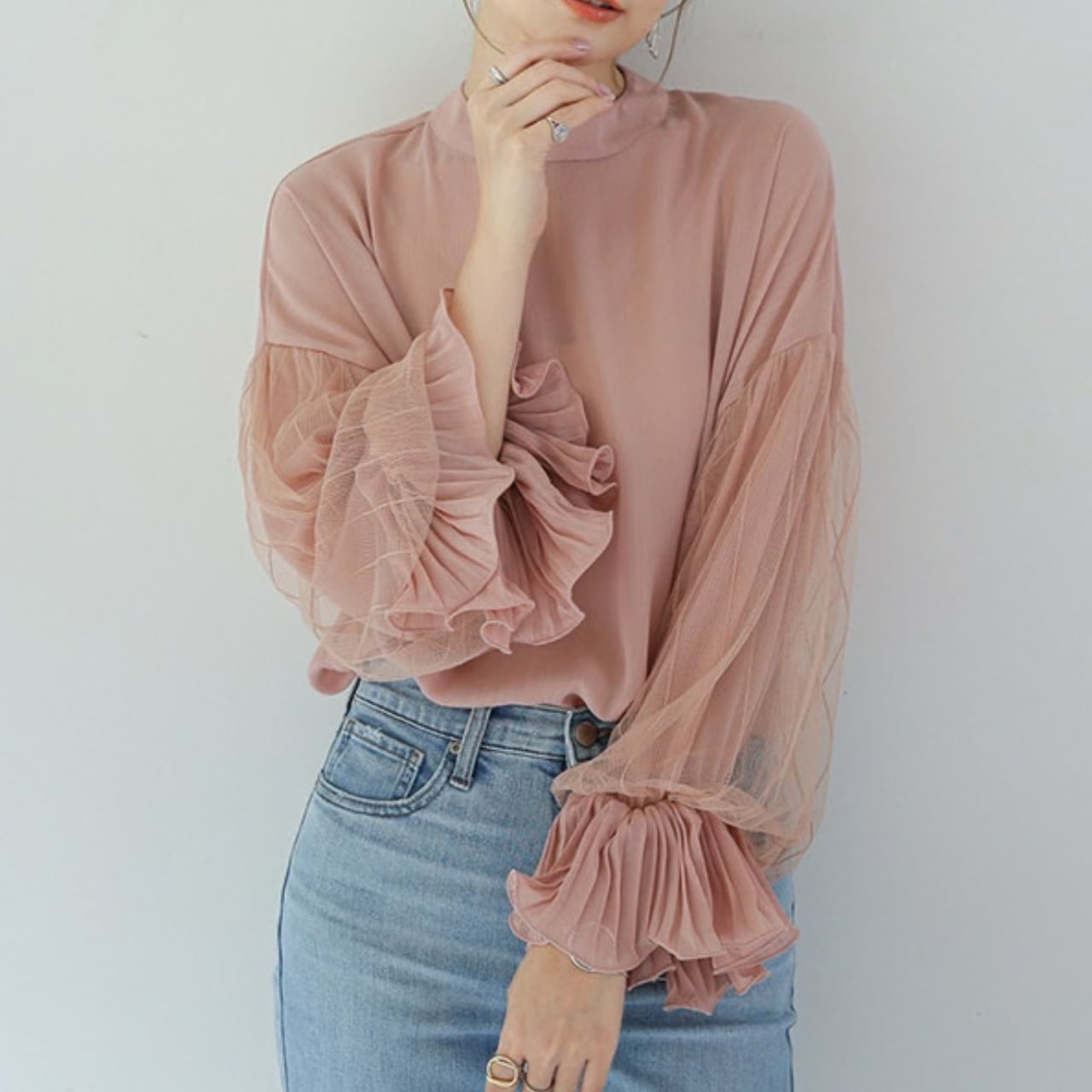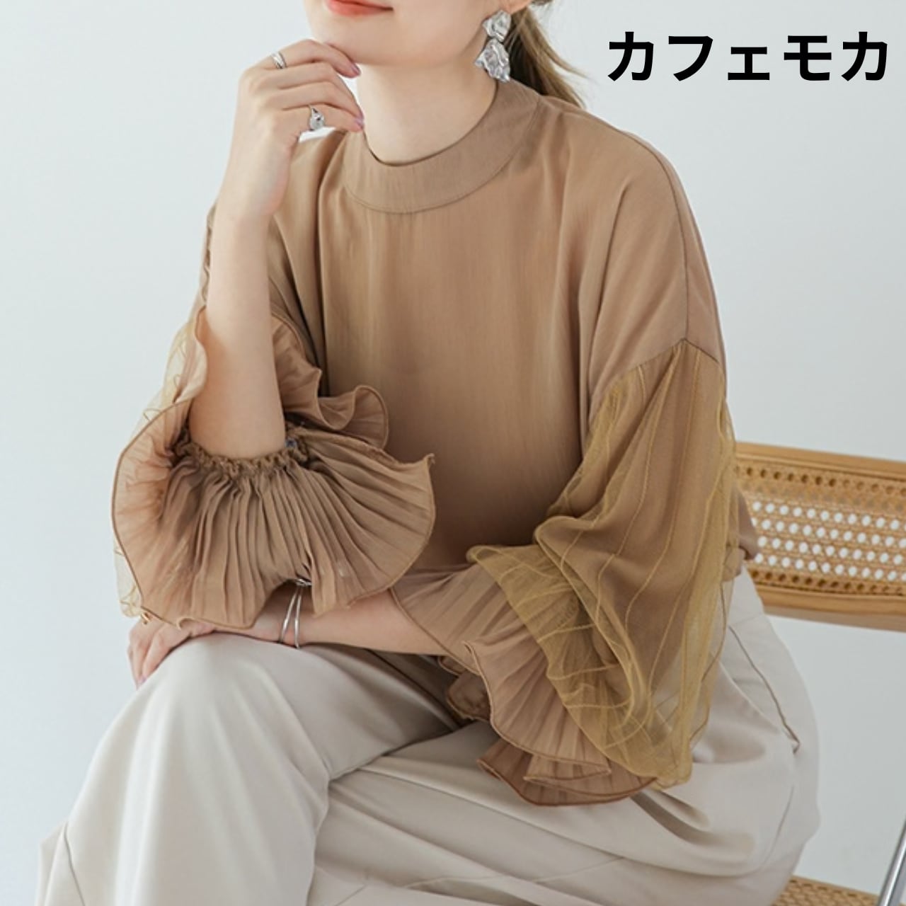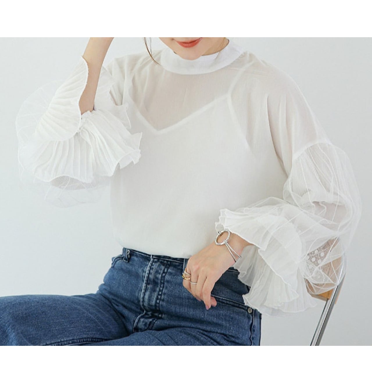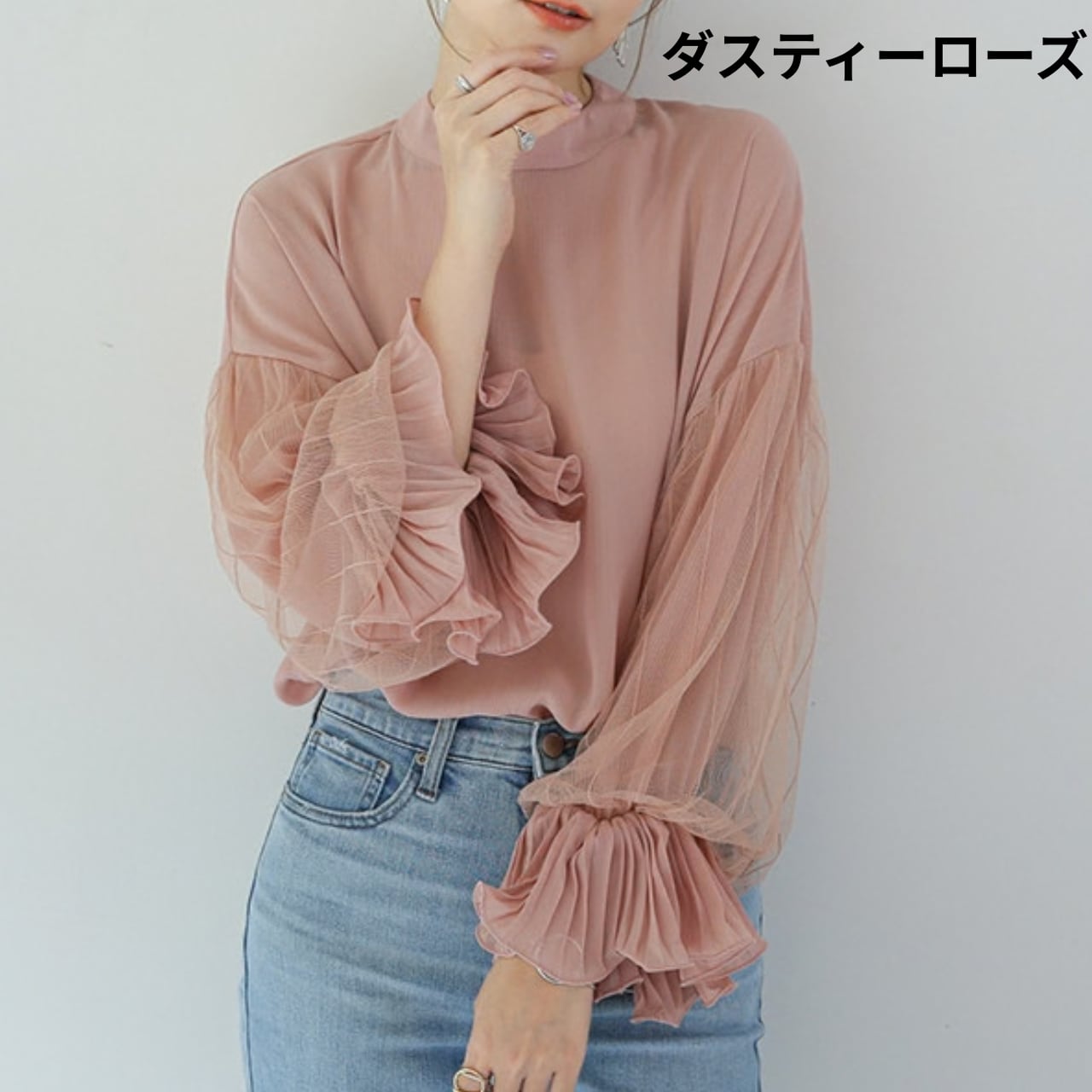 大人の可愛さを引き寄せるチュールスリーブブラウス。