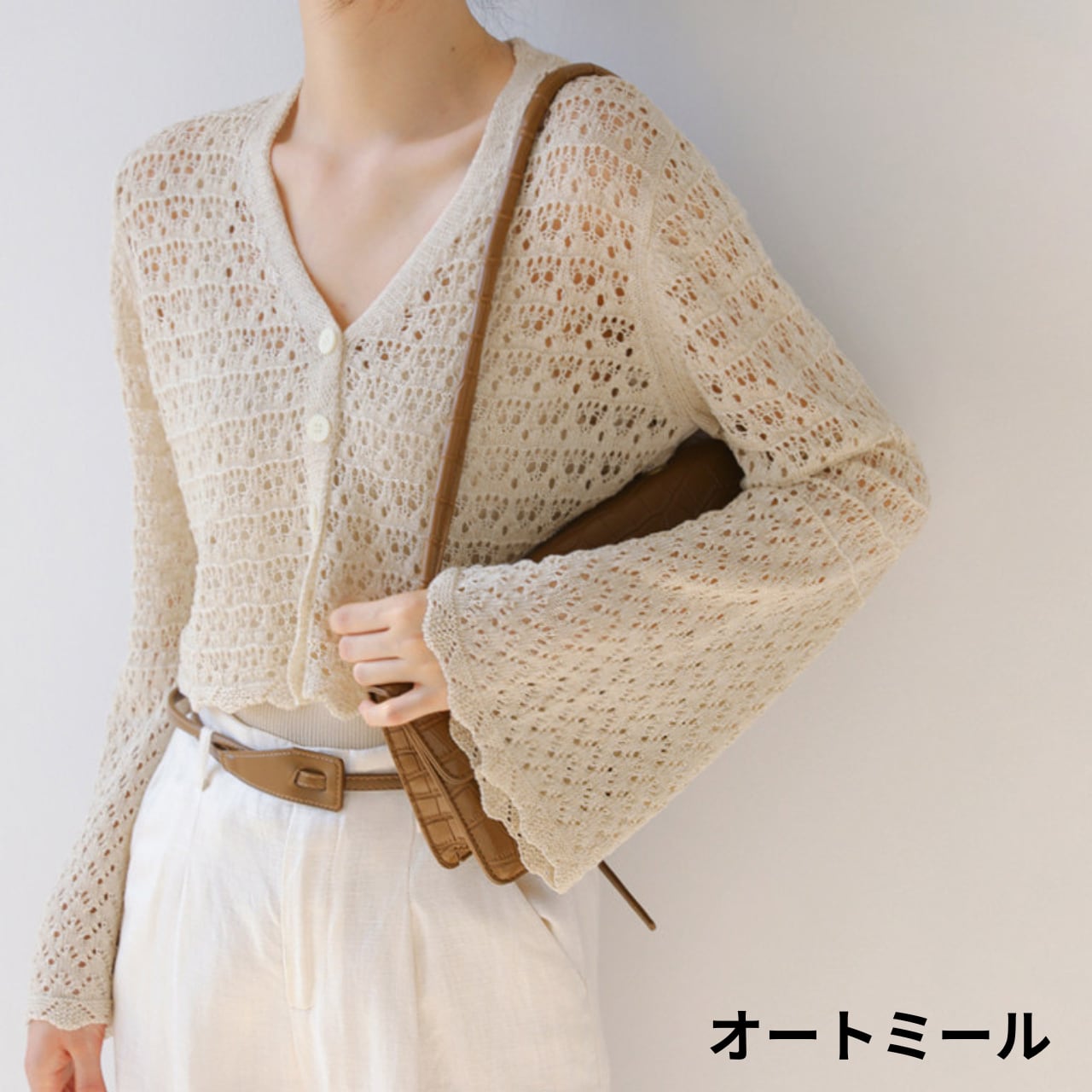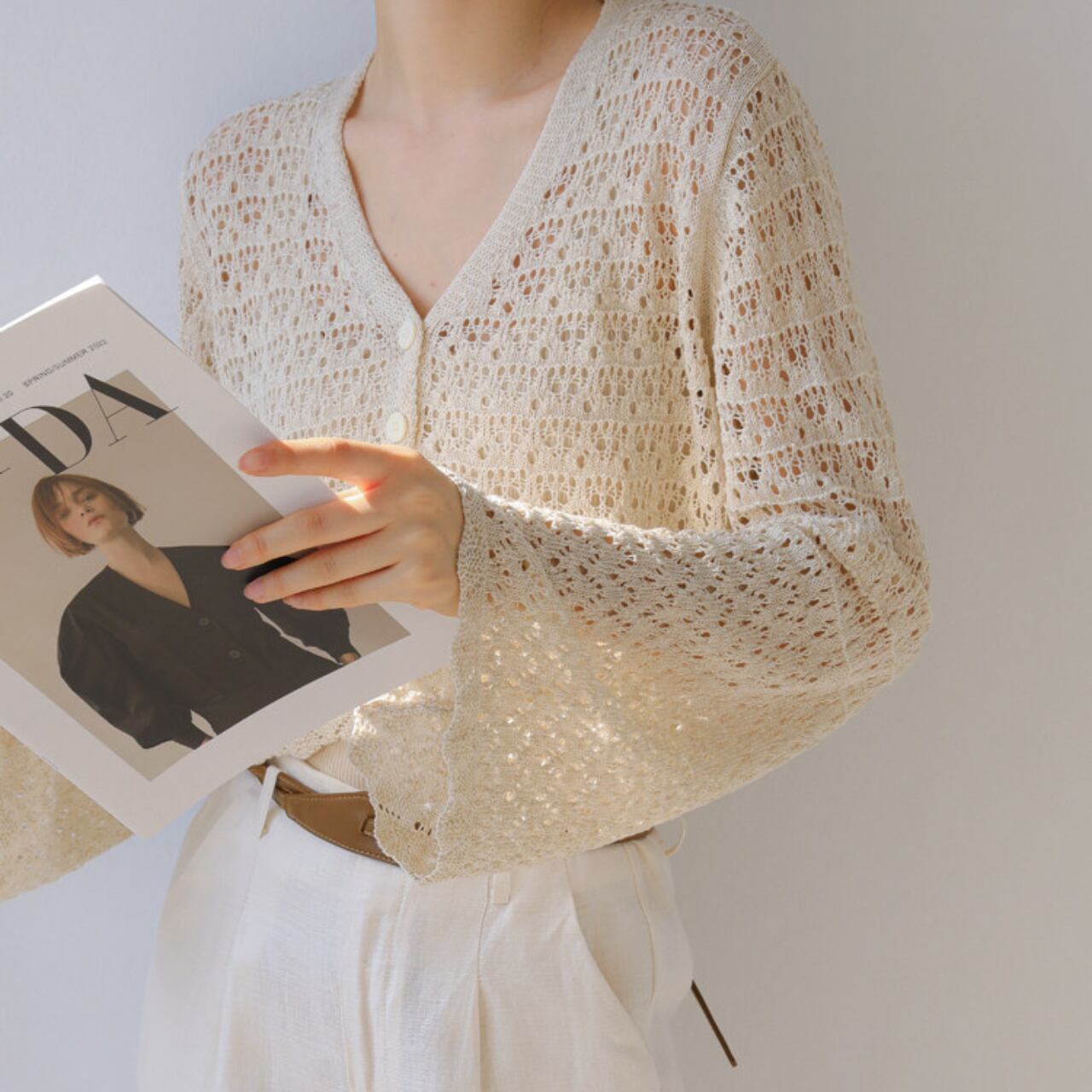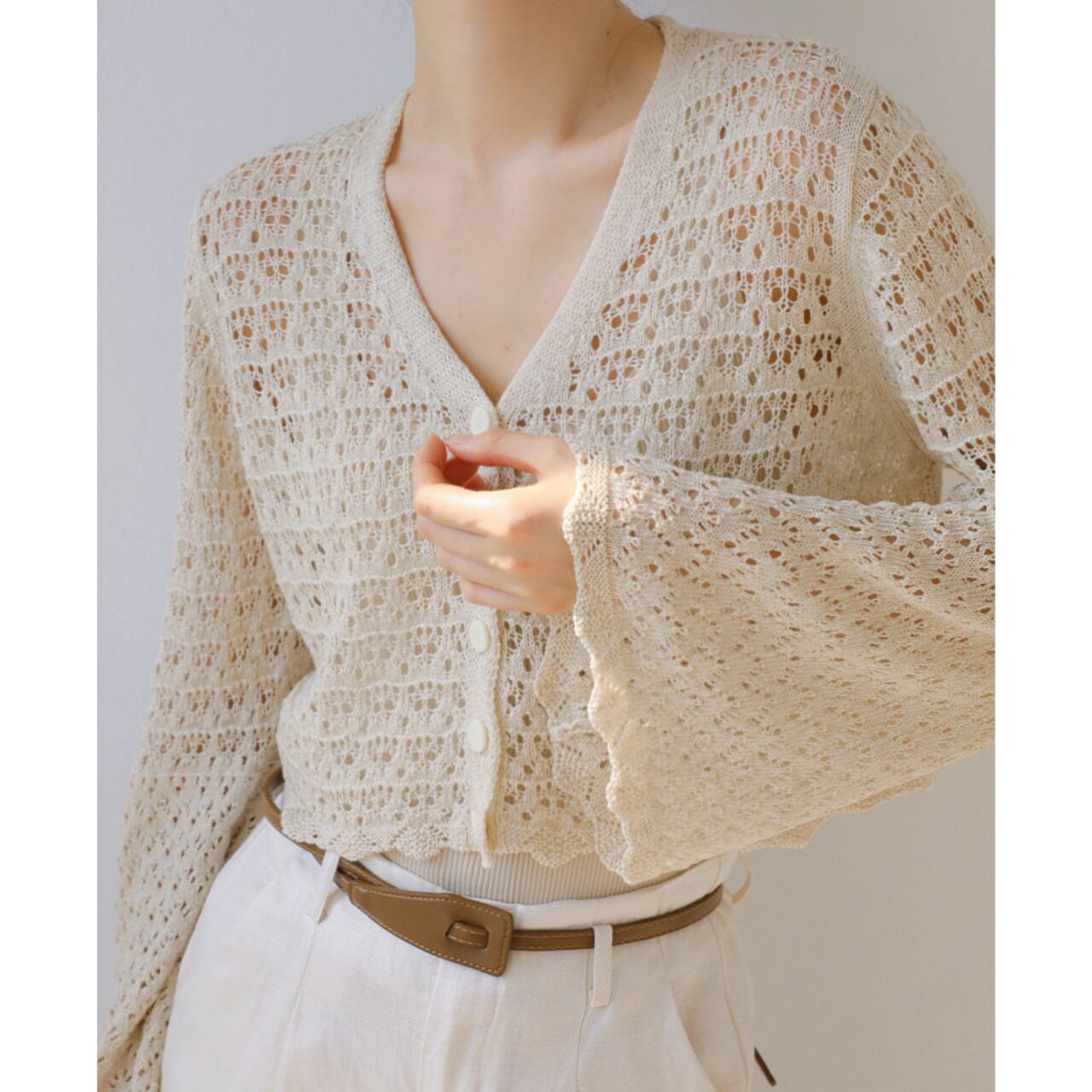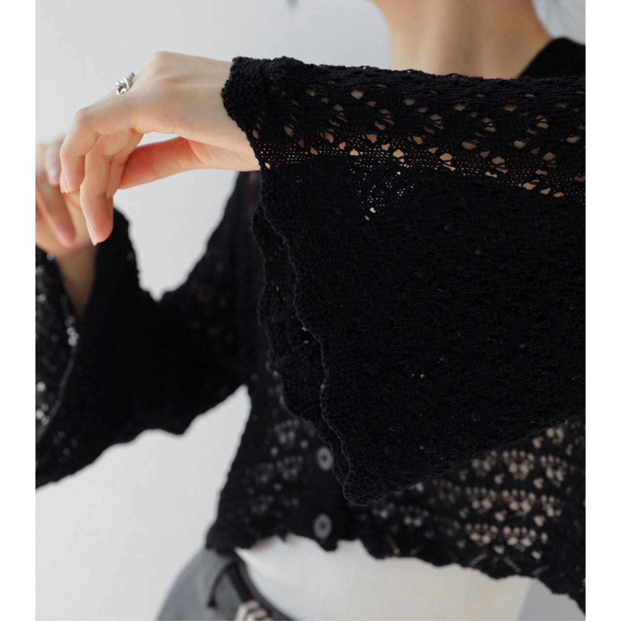 クロップド丈のシルエットが魅力的なレースカーディガン。