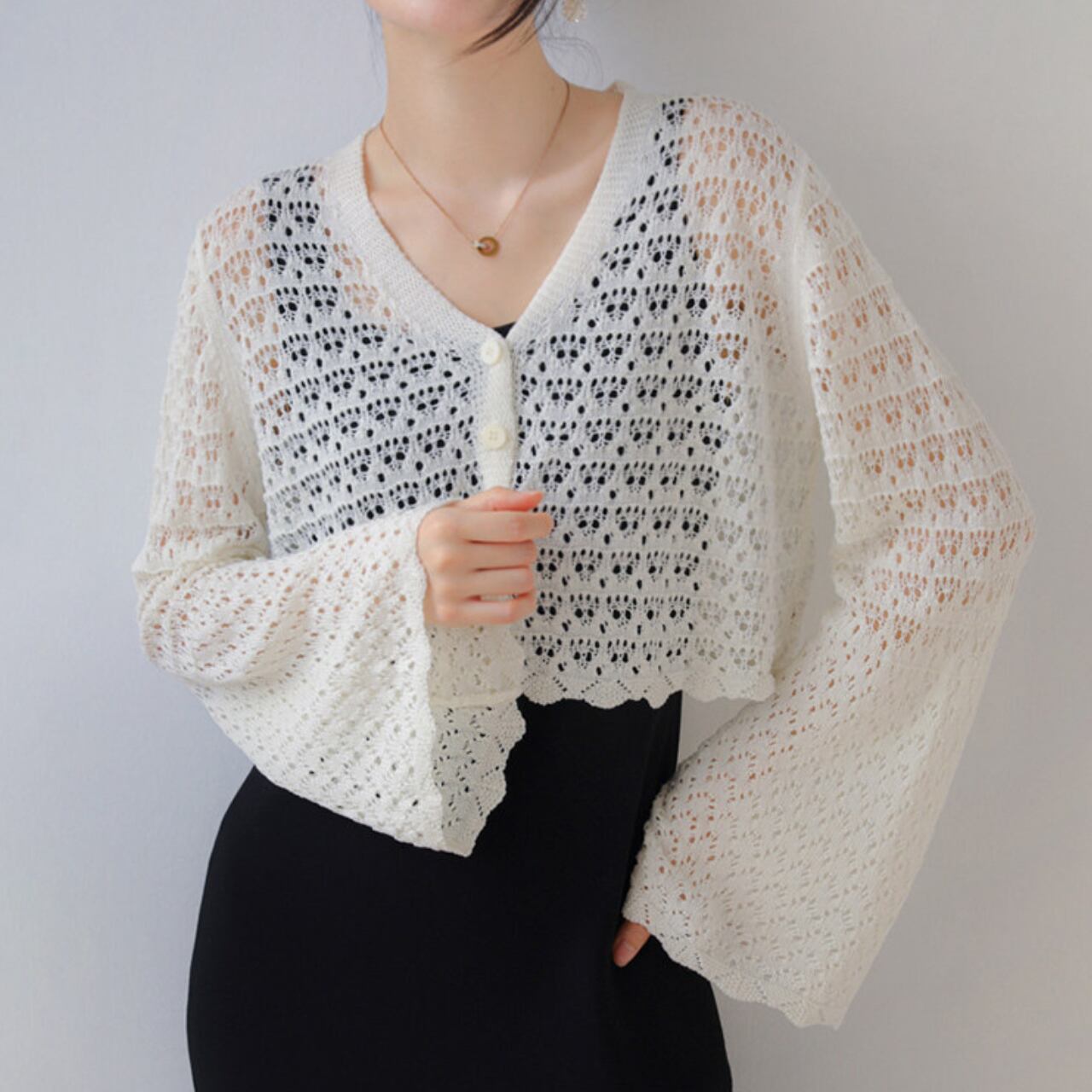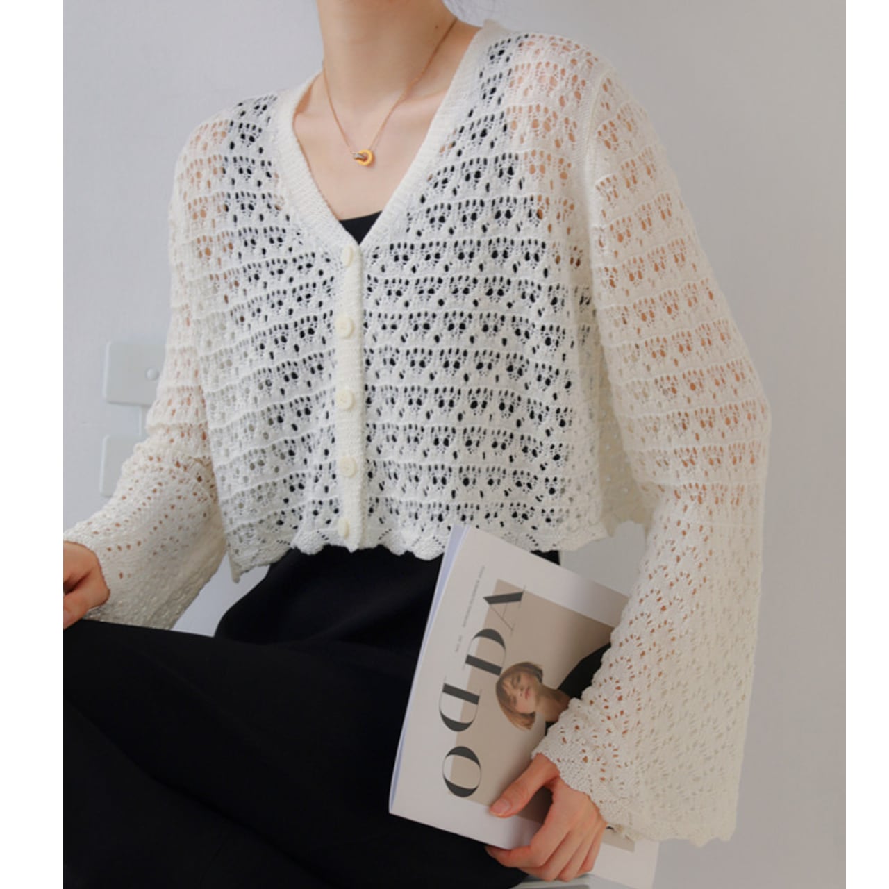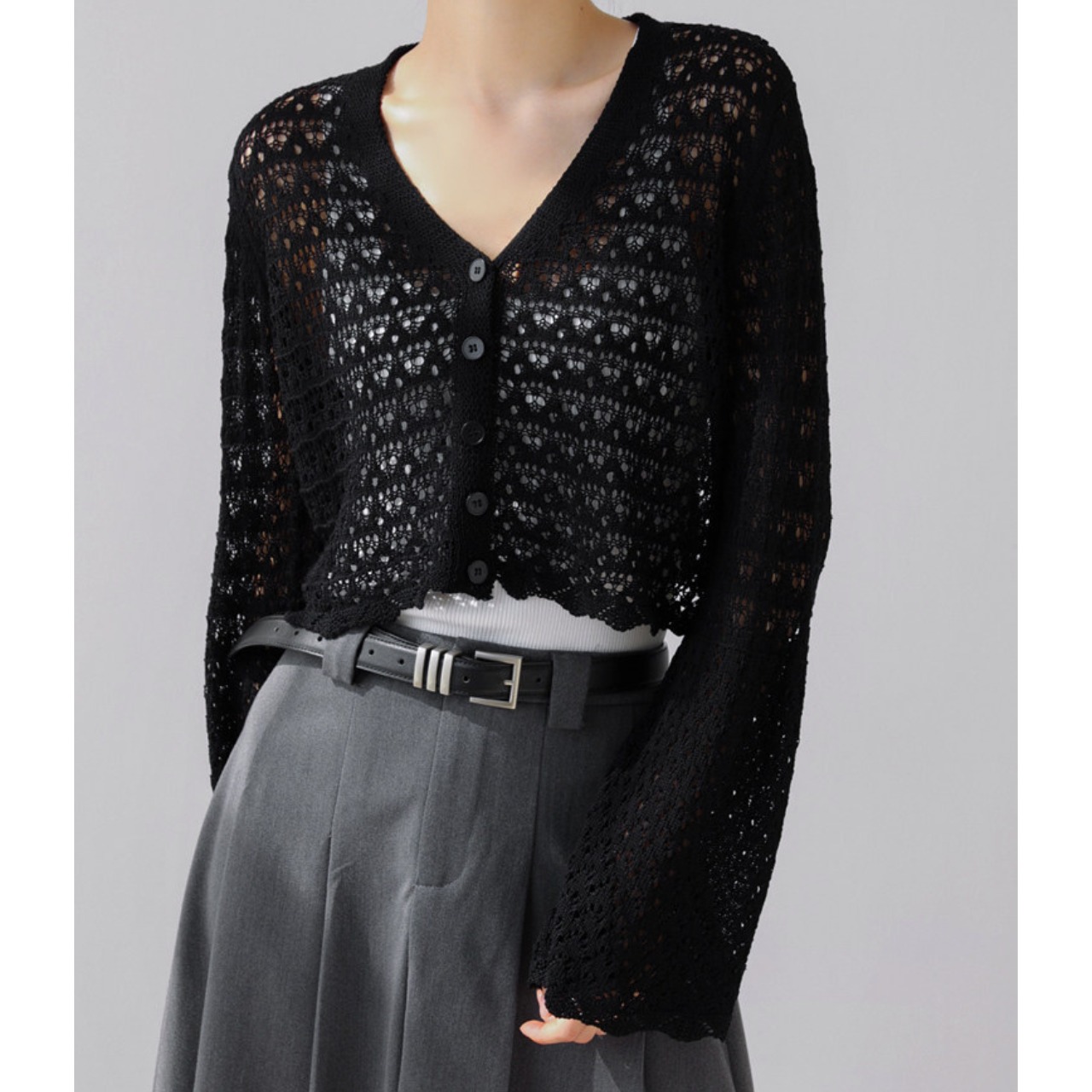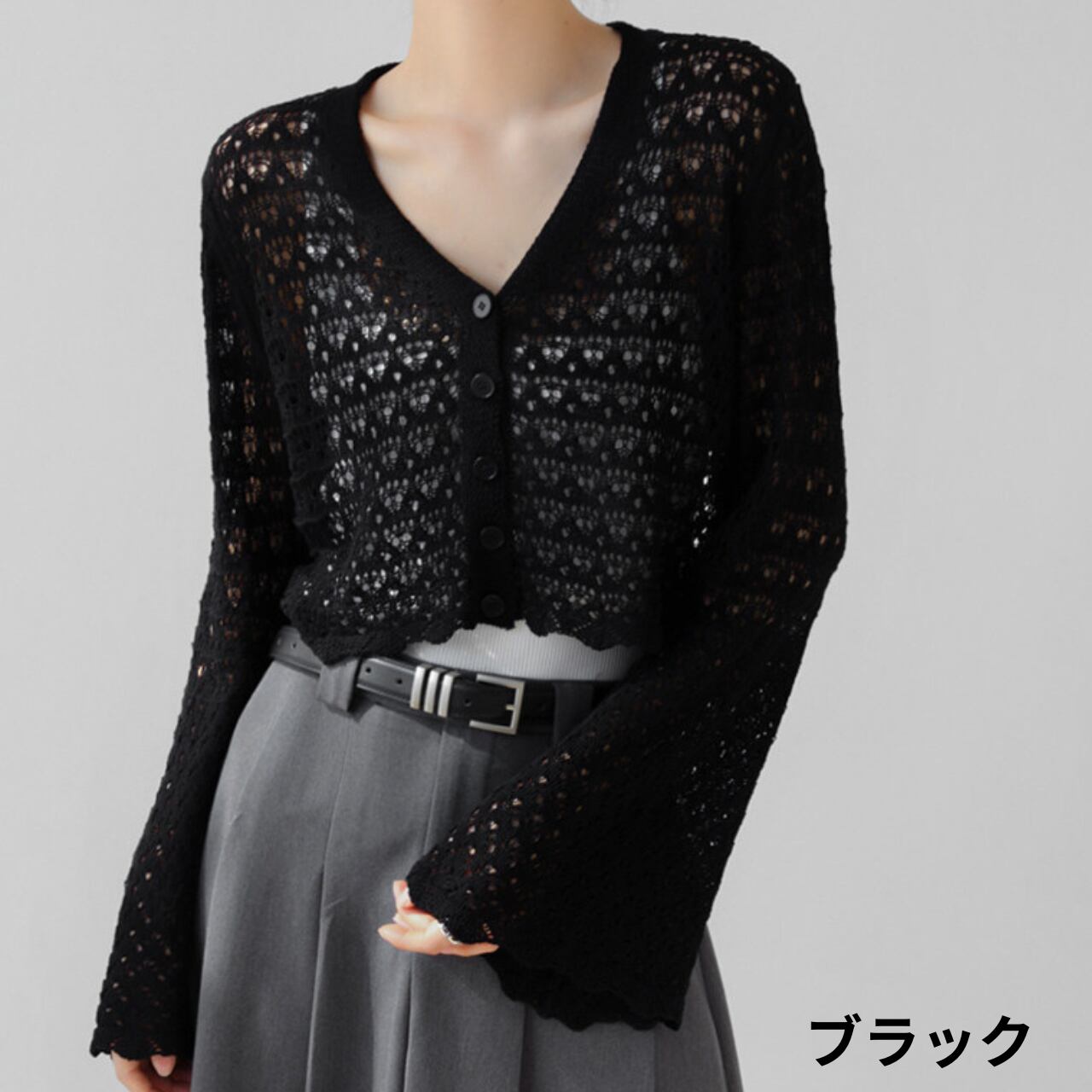 ボタンフロント クロップド丈 長袖 レースカーディガン 00153