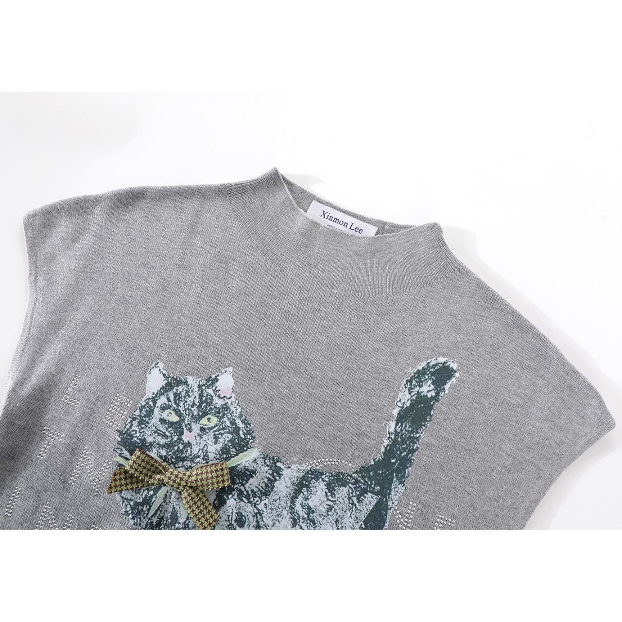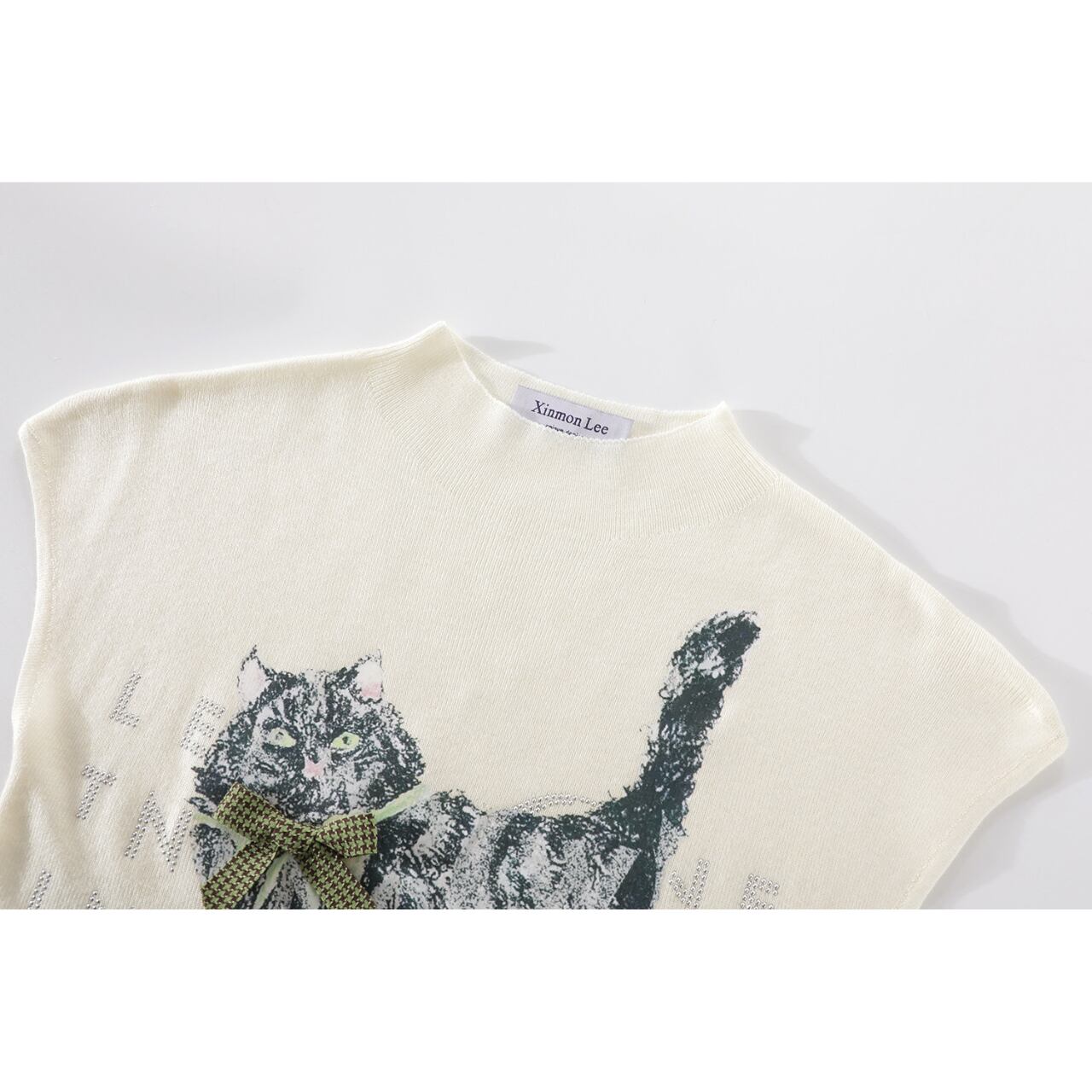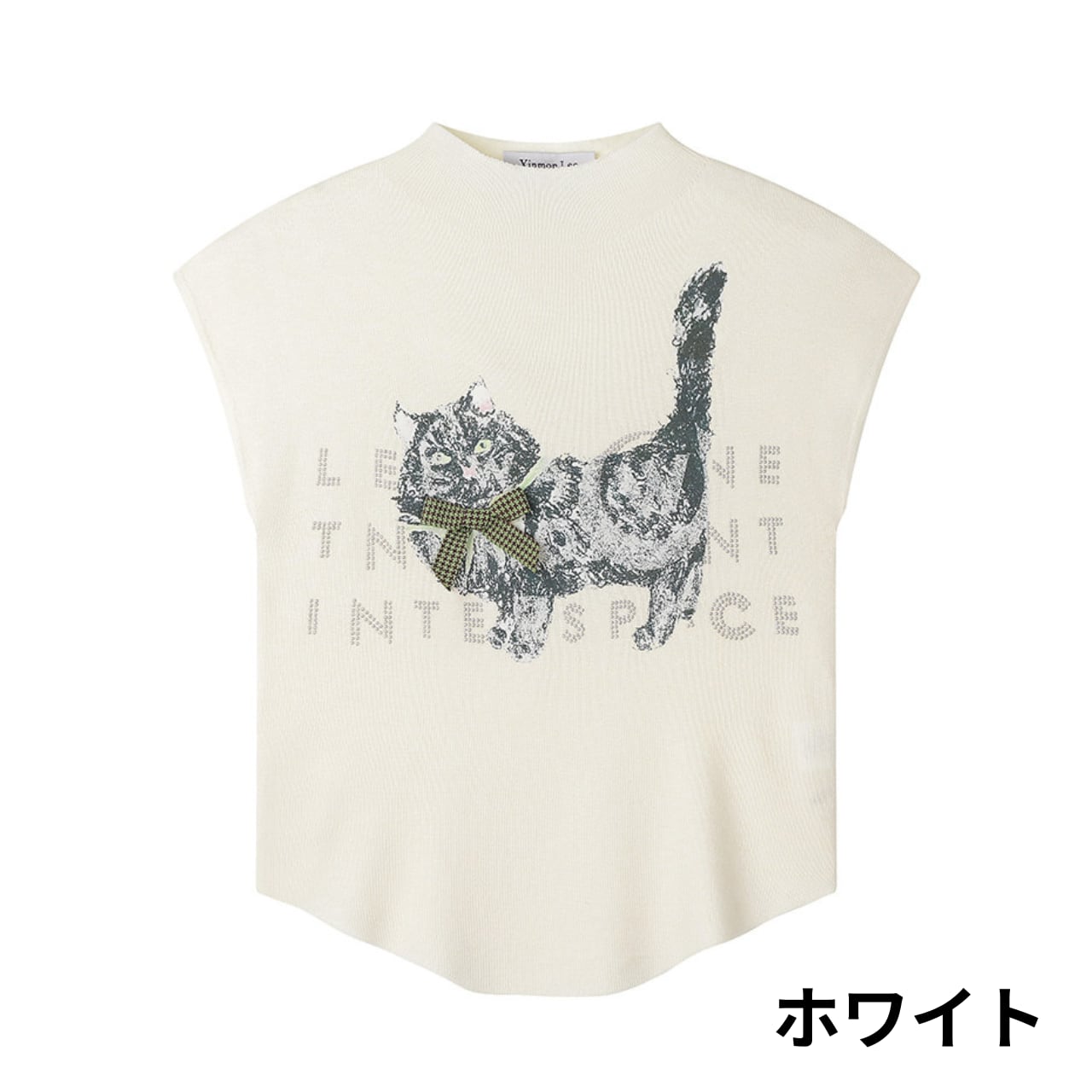 猫柄 ノースリーブ 腰丈 ニットトップス 00160