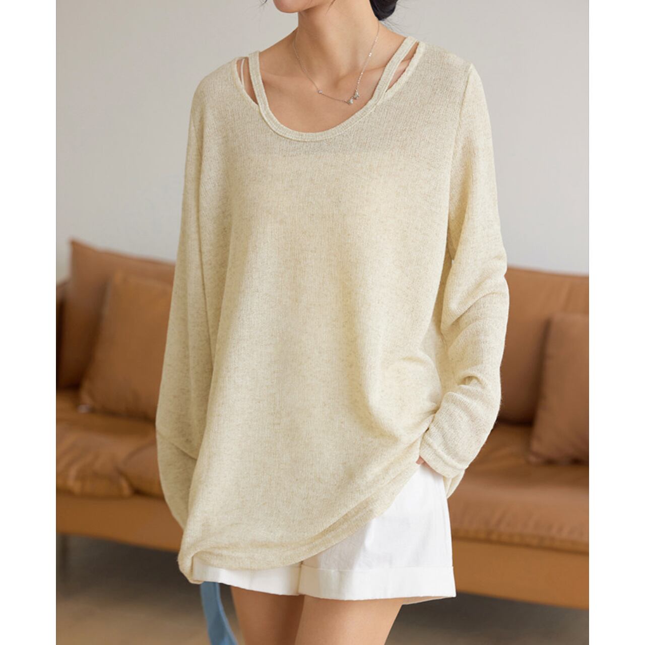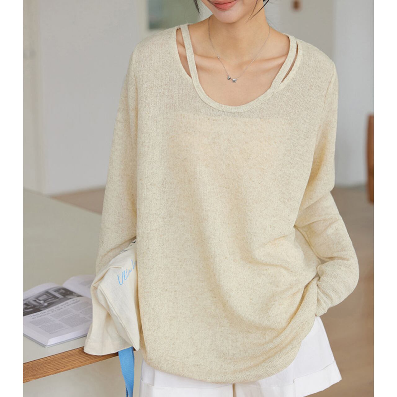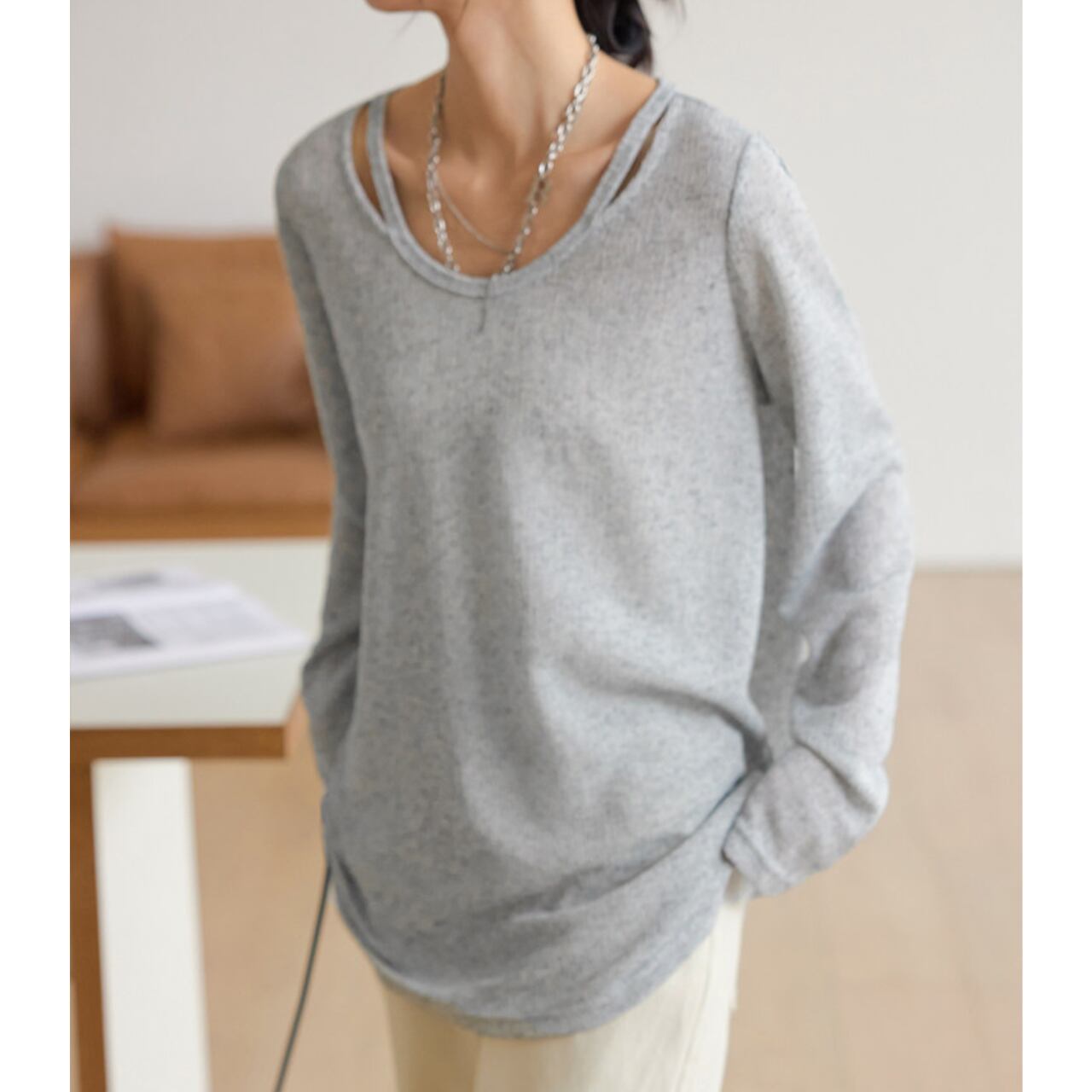 深めのVネックがデコルテを美しく見せ、