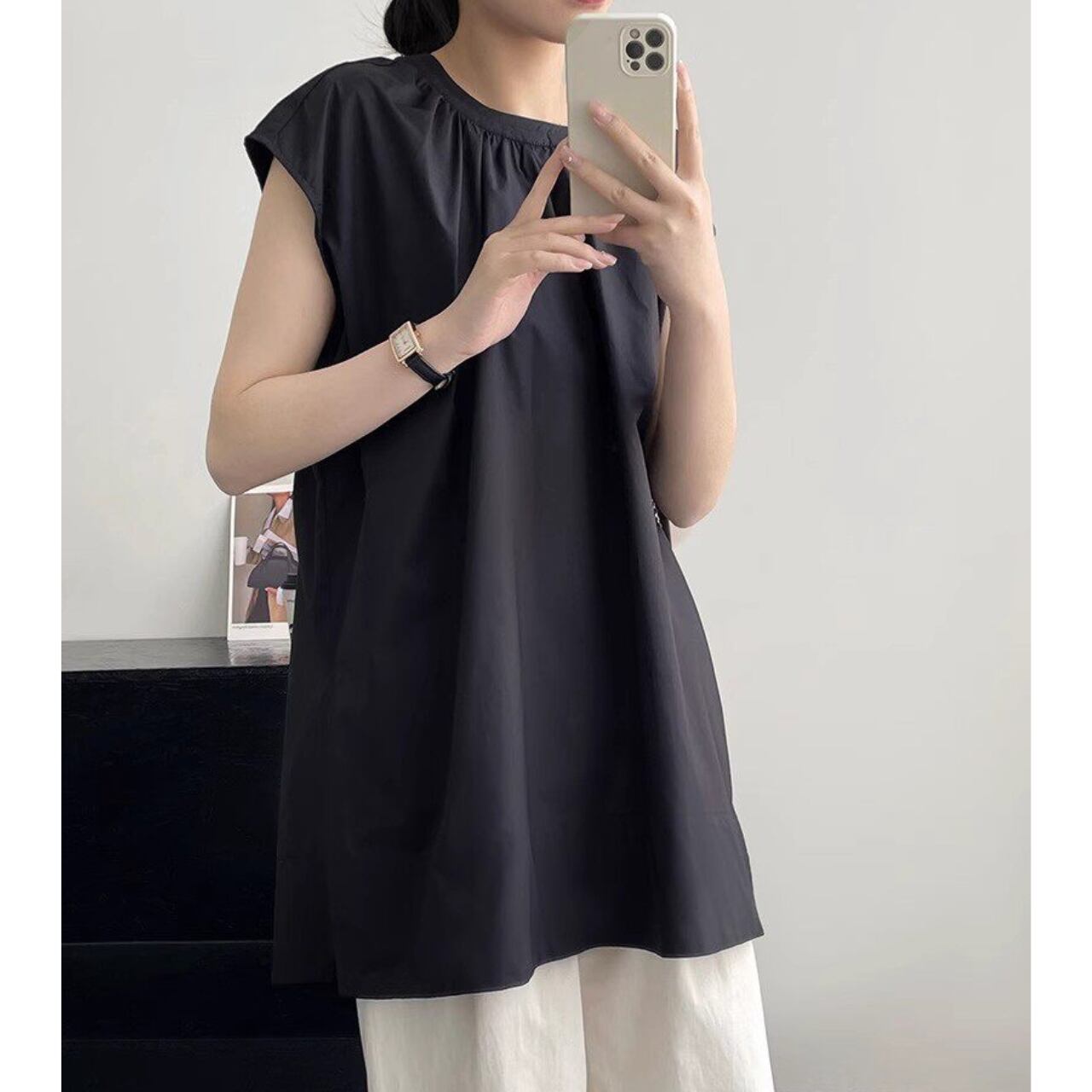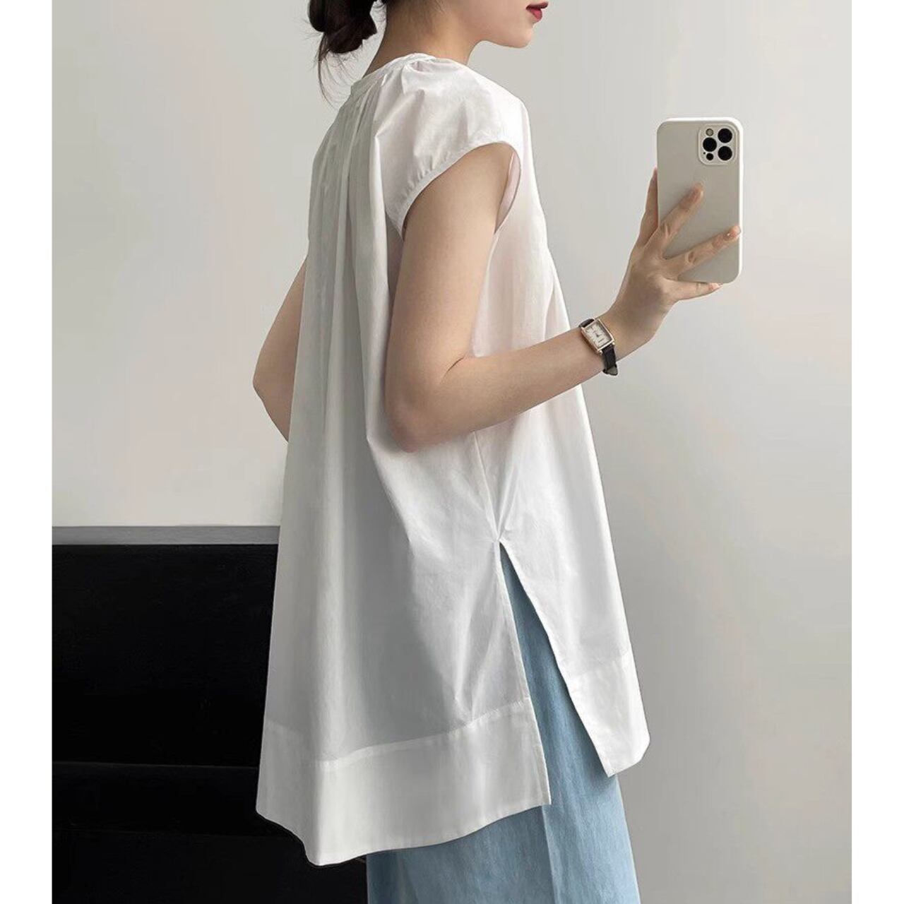 スリット 半袖 ヒップ丈 Aライン ブラウス 00173