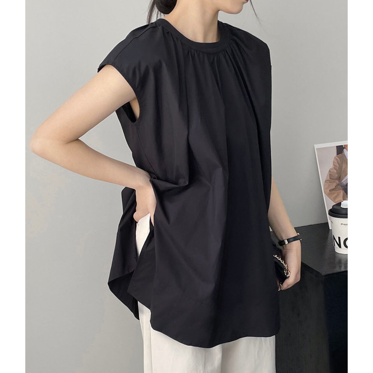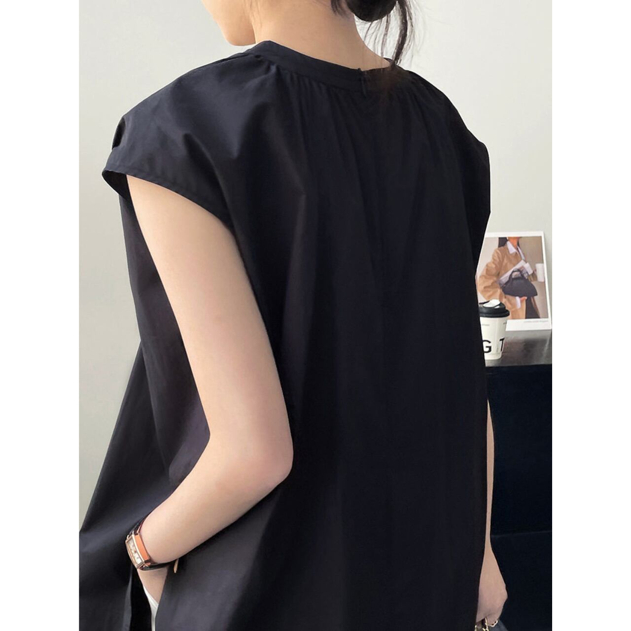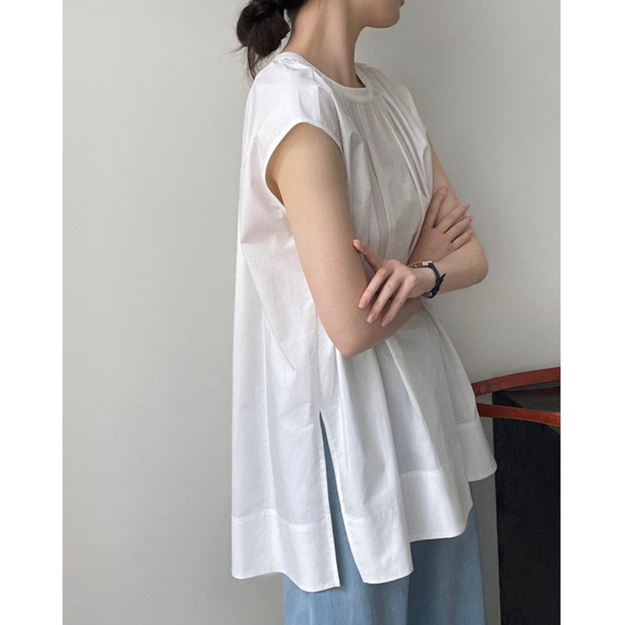 スリットがアクセントの半袖ブラウス。
