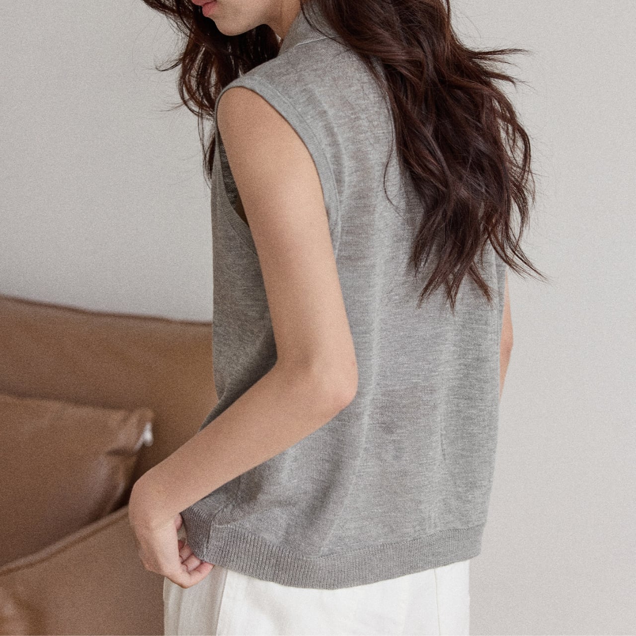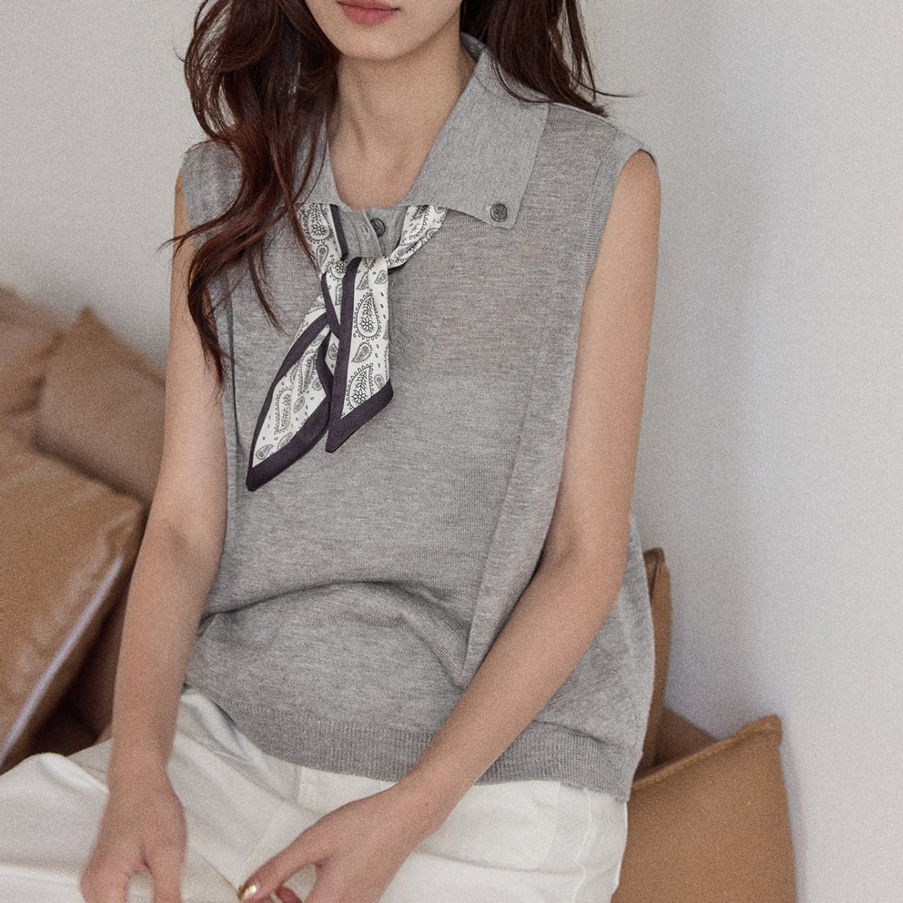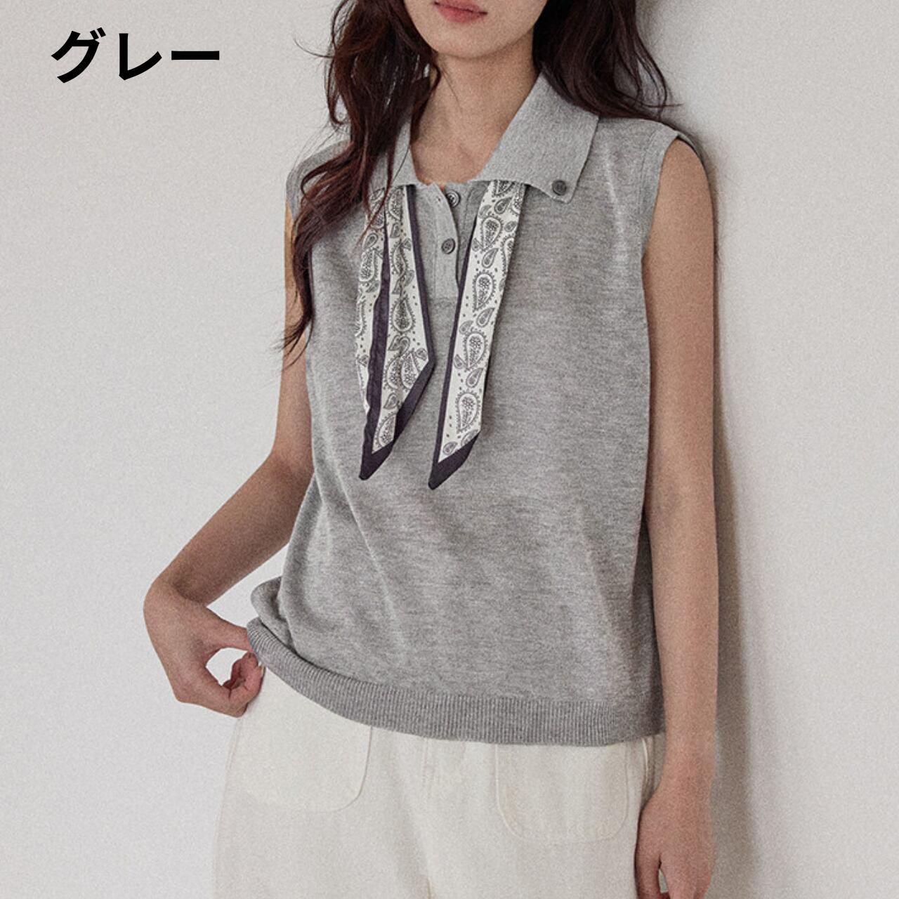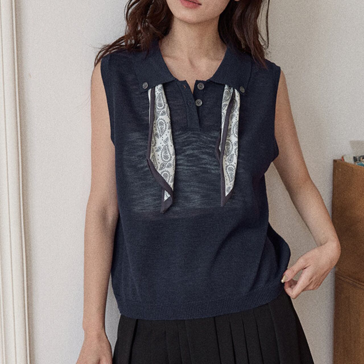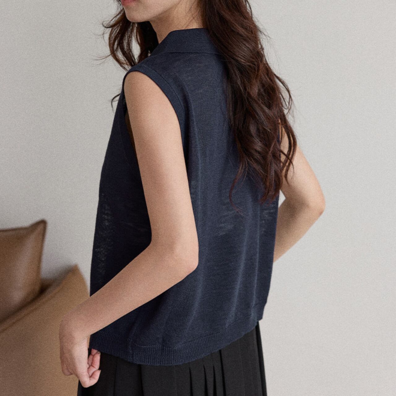 上品な印象を与えるノースリーブのニットポロシャツ。