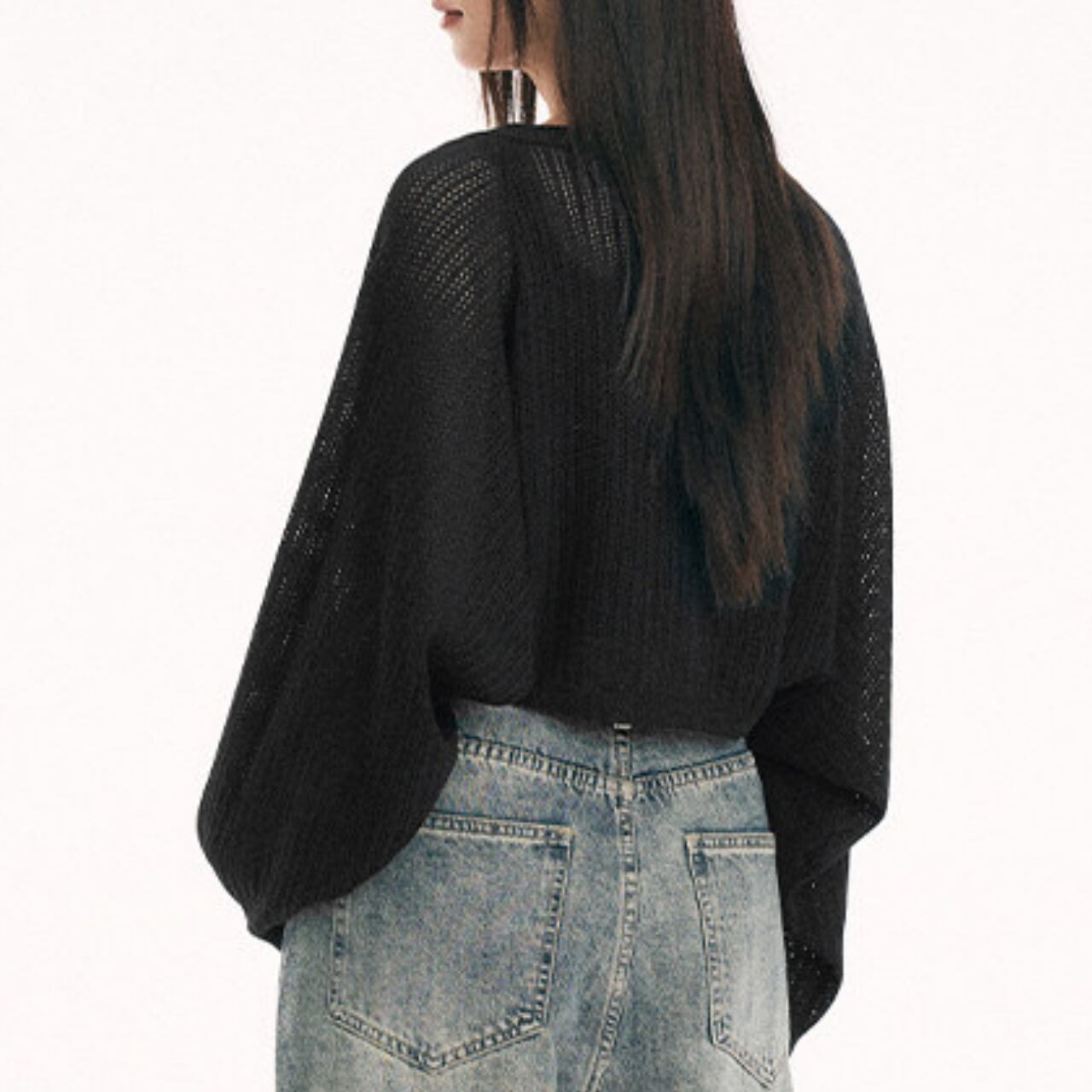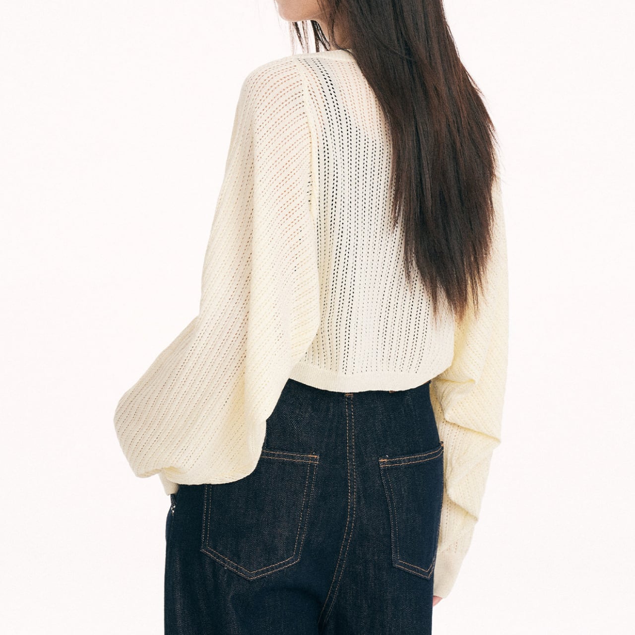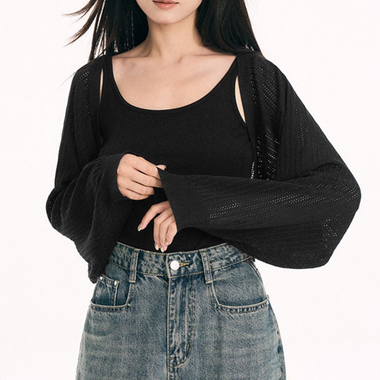 さっと羽織れるオープンフロントの長袖ニットカーディガン。