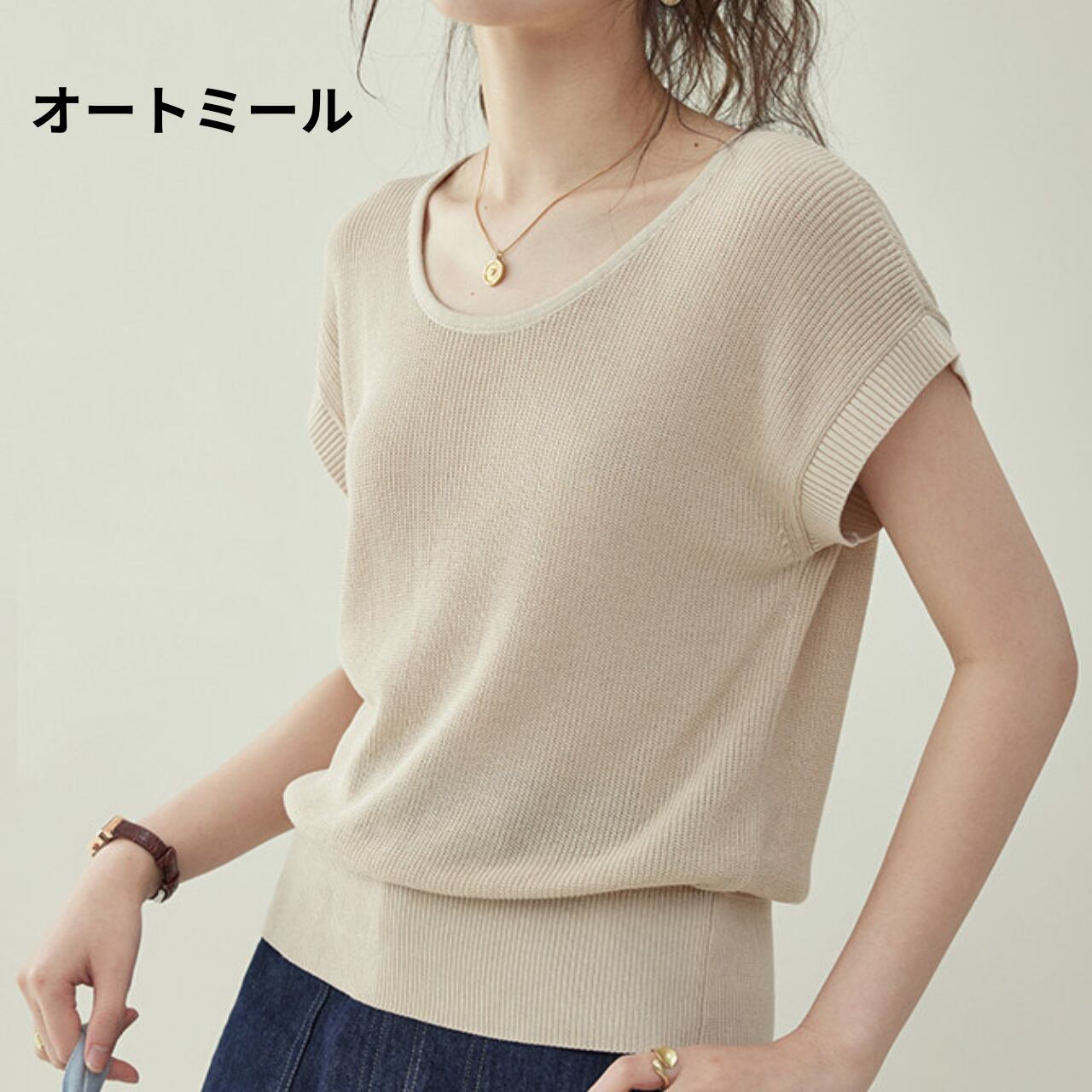 涼しげな印象を与えるラウンドネックの半袖ニット。