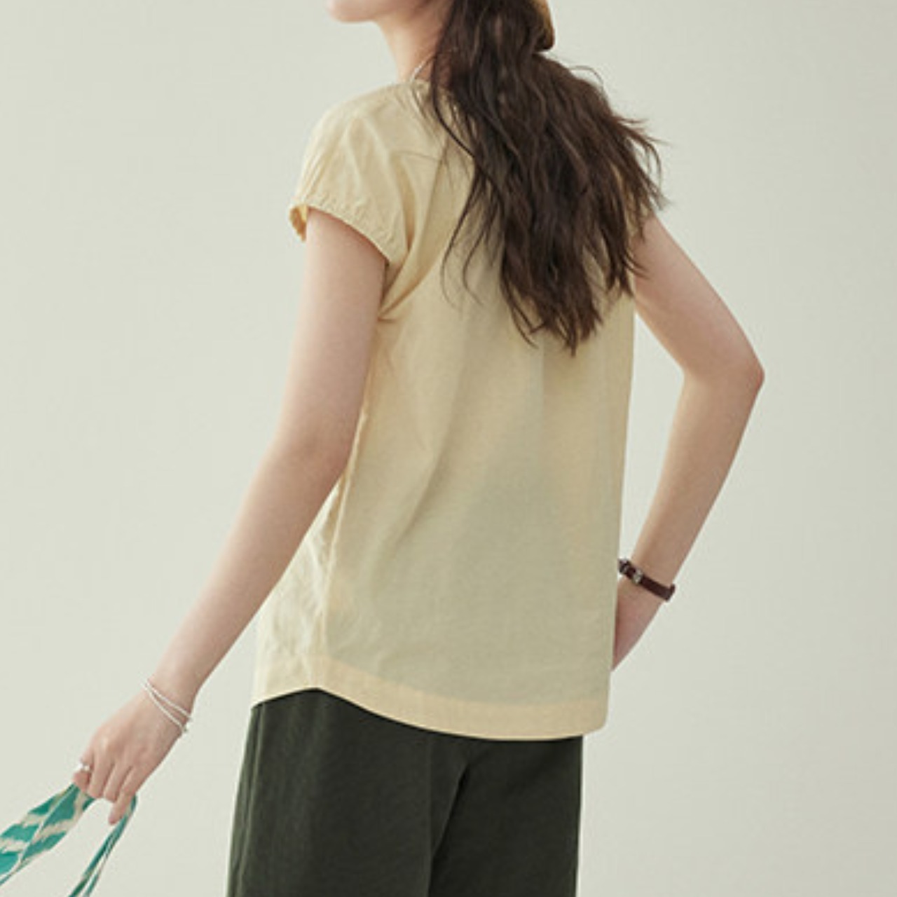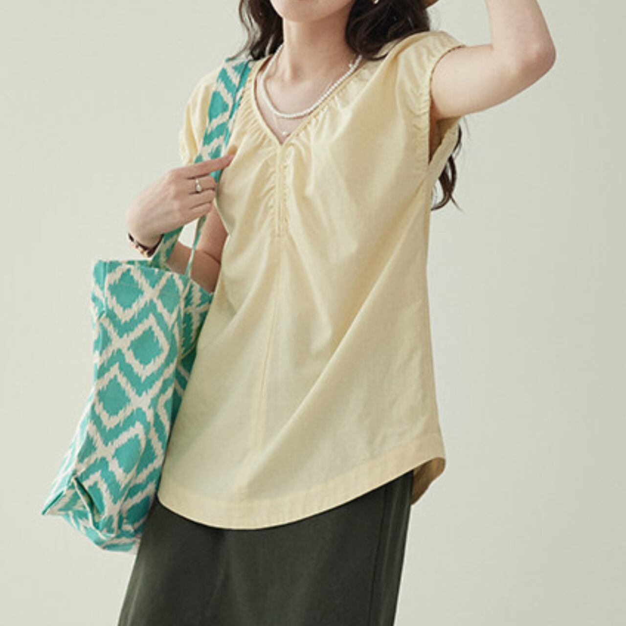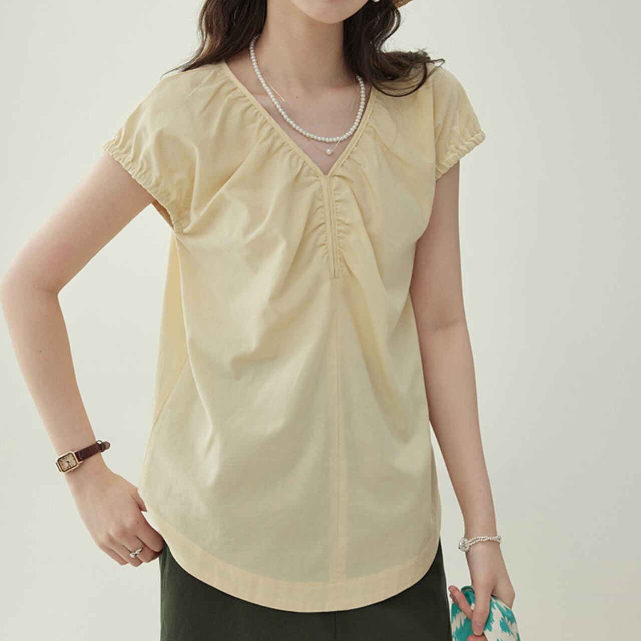 Vネックが首元をすっきりと見せてくれる半袖ブラウス。