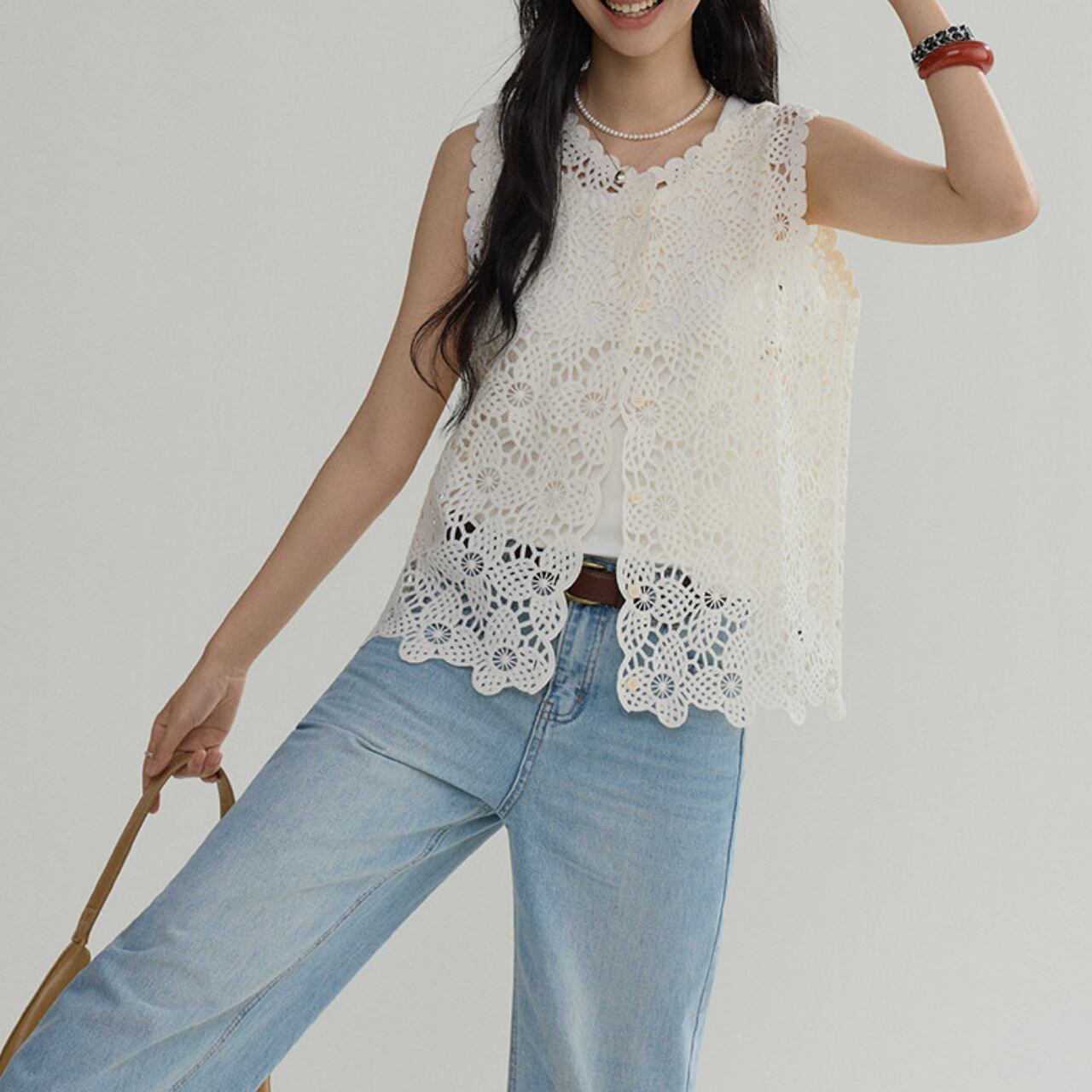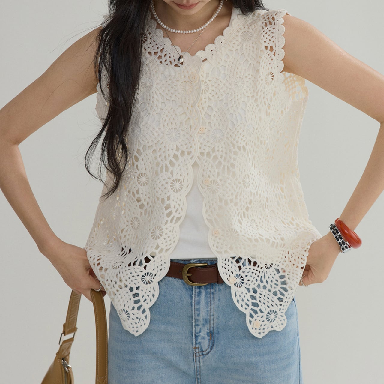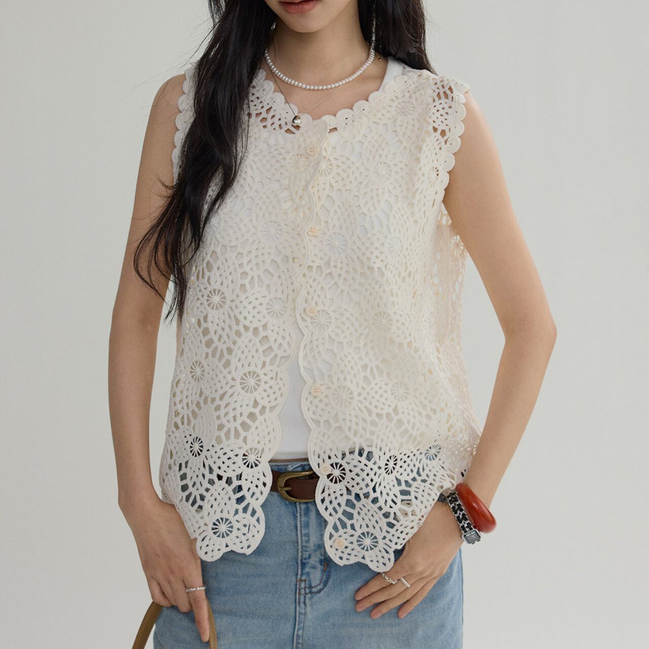 ボタンフロント ノーカラースカラップヘムレースベスト 00214